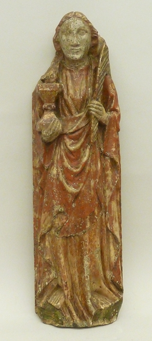 De apostel is staande afgebeeld met een veelhoekige kelk in zijn rechter- en een palmtak in zijn linkerhand. Uit de kelk steekt de kop van een slang, die herinnert aan Johannes' wonderbare redding van een vergiftigingsdood. Hij staat op een rotsgrond. Hij draagt een lang gewaad dat tot over de grond en rond zijn blote ...