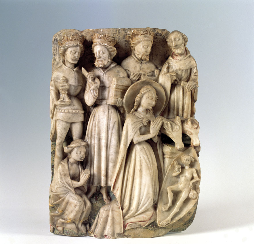 In het midden op de voorgrond aanbidt Maria, driekwart naar rechts gewend, met gevouwen handen knielend het naakte Christuskind. Om haar hoofd een aureool. Het kind ligt voor haar op de grond, en is omgeven door een mandorla-vormige lichtschijn. Het buitengewoon magere kind heeft zijn rechterhand zegenend opgeheven. Naast zijn linkerheup ligt de wereldbol. Achter ...