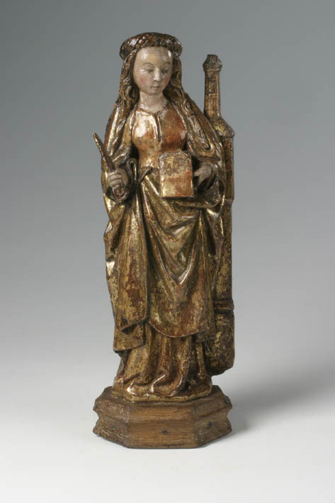 Barbara is staande voorgesteld, rustend op haar linkerbeen. Ze draagt een palmtak in haar rechterhand. Met haar linkerhand houdt ze een boek ondersteboven voor zich. Haar duim steekt tussen de bladeren. Haar hoofd is iets naar rechts gewend. Lange, golvende haarstrengen liggen over haar schouders. Rechts achter haar staat haar attribuut, de toren. Zij staat ...