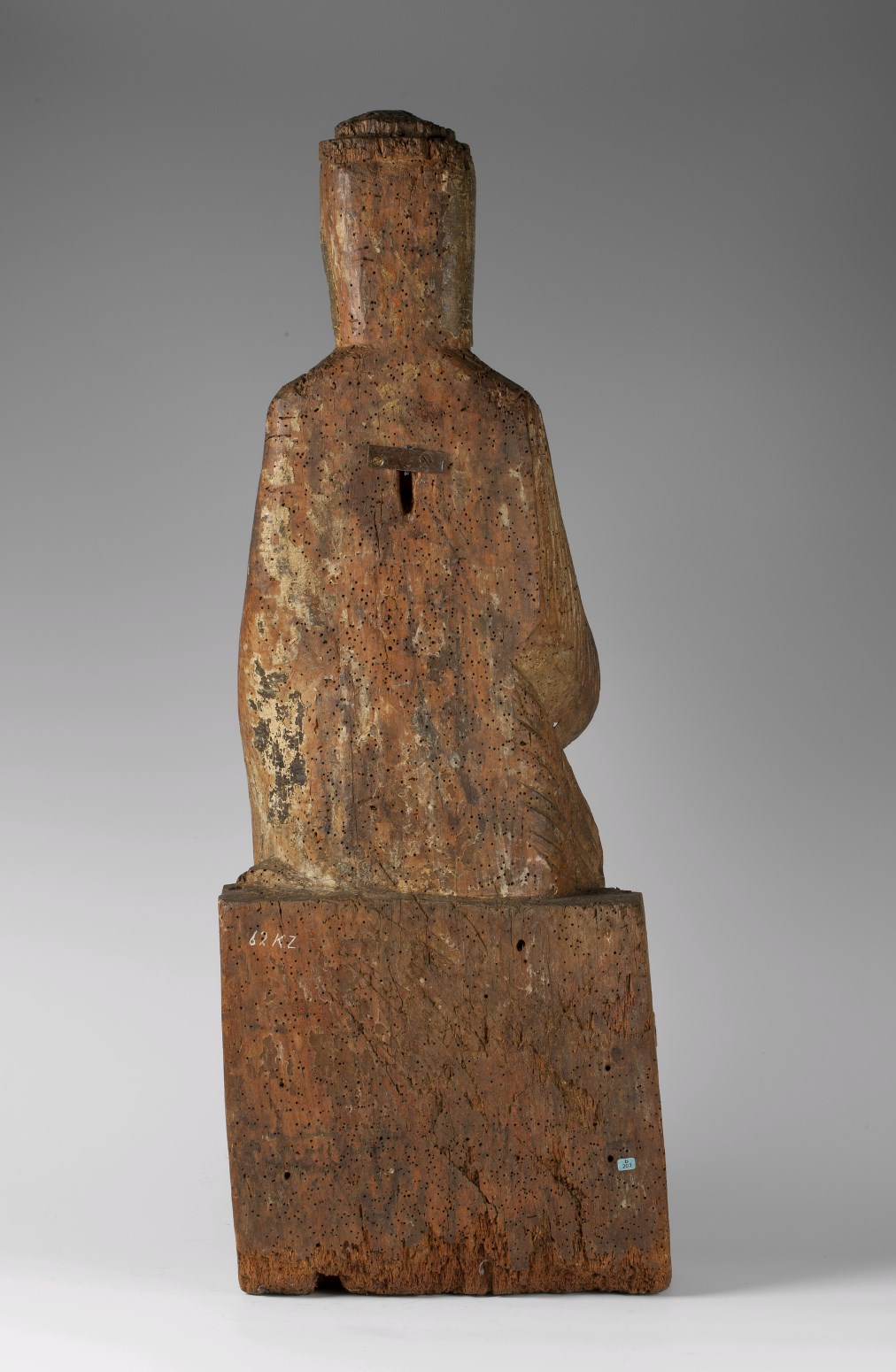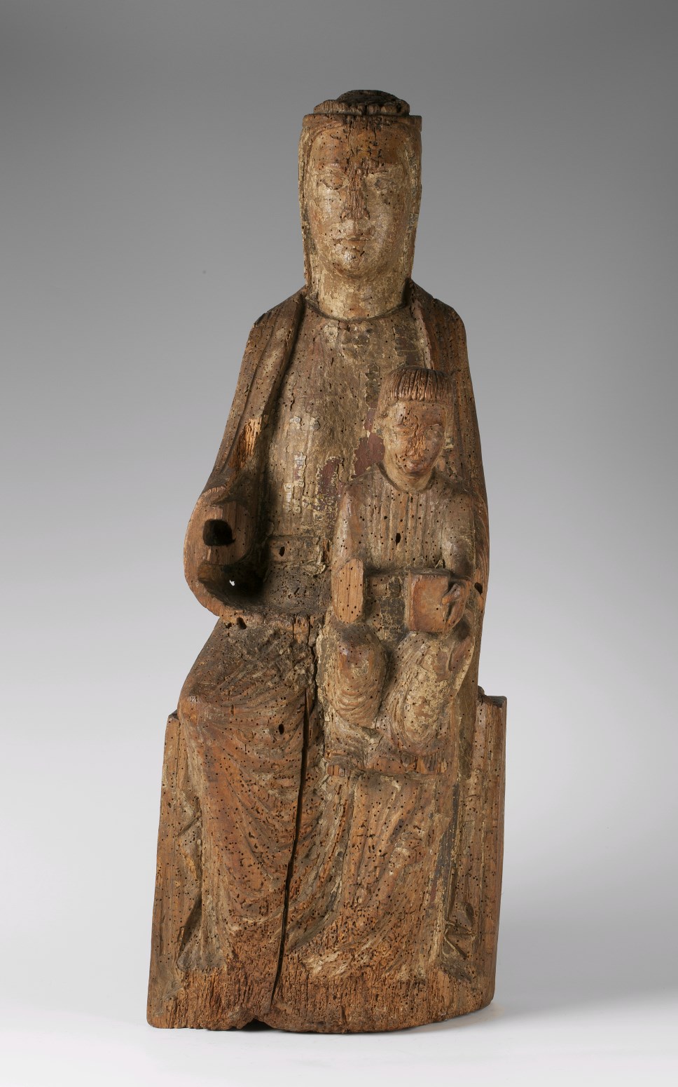 Maria zit frontaal op een bankje. Het kind zit eveneens frontaal op haar linkerknie. Het heeft een blokvormig boek in zijn linkerhand. Maria steunt het kind bij zijn linkerknie. Maria draagt een gegord gewaad, waaroverheen een mantel die over beide schouders ligt en naar rechts over de schoot is gedrapeerd. Op haar hoofd een korte ...