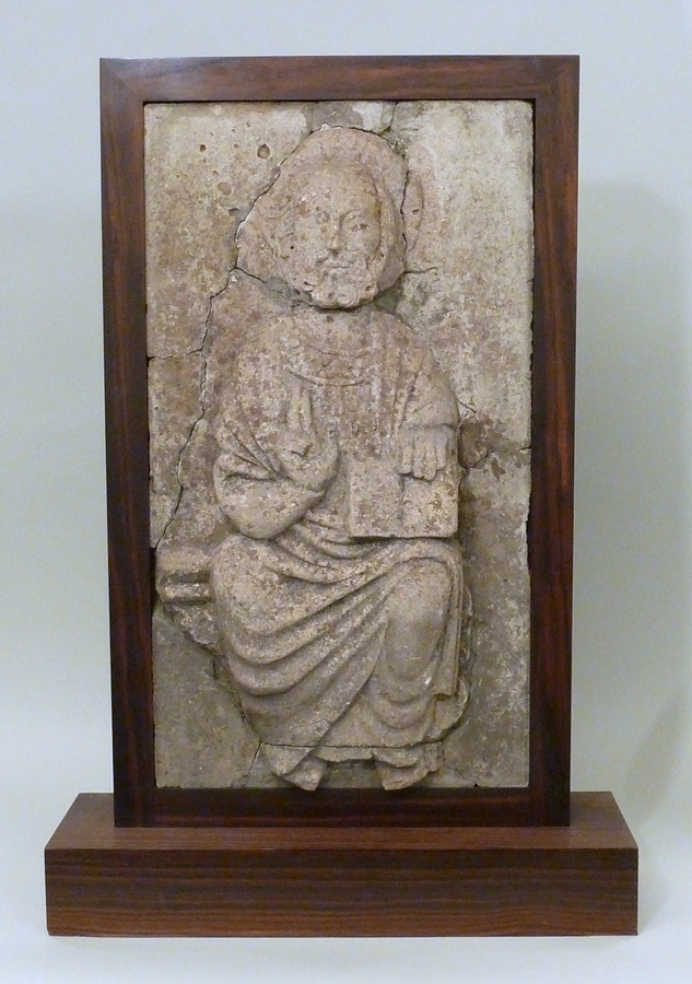 Christus zit frontaal op een troon, waarvan aan de linkerzijde de geprofileerde bovenrand zichtbaar is. Hij heeft zijn rechterhand zegenend opgeheven. Met zijn linkerhand houdt hij een opengeslagen boek vast, dat hij op zijn linkerknie steunt. Zijn korte baard is gekruld. Om zijn hoofd een kruisnimbus. De figuur is geplaatst tegen een vlakke achtergrond. Christus ...