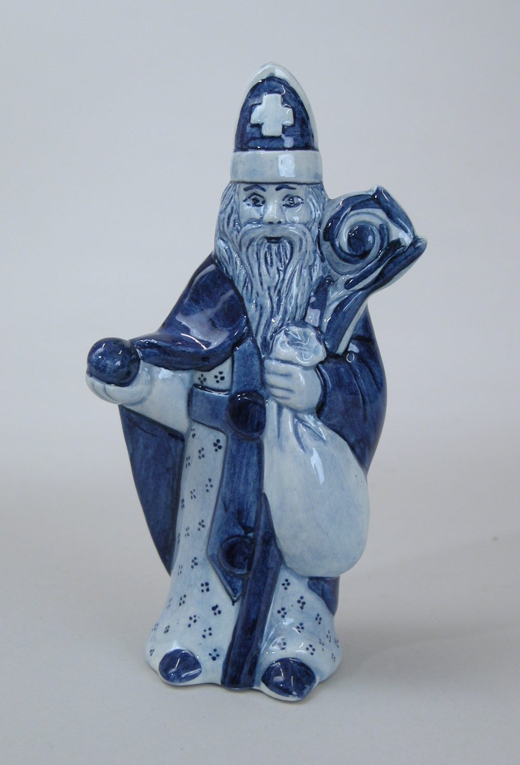 Delftsblauw beeldje van Sint Nicolaas met in rechterhand een bal