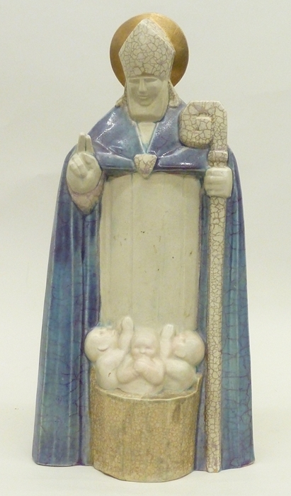 Zegenende Sint Nicolaas in paars-blauwe koorkap met staf en drie kindjes in tobbe