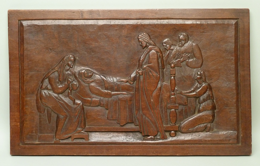 Wandbord met in reliëf voorstelling van De opwekking van het dochtertje van Jaïrus