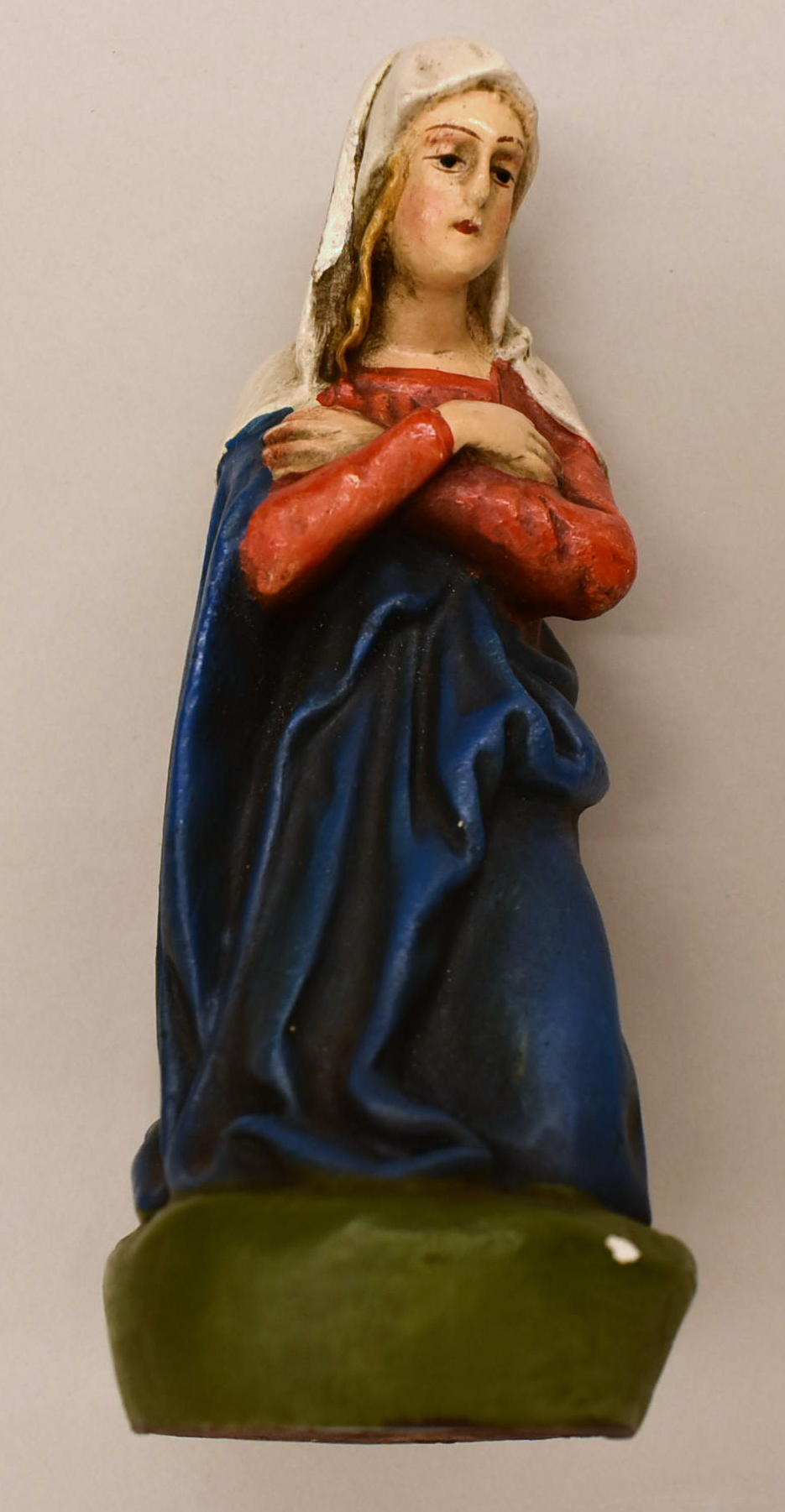 Knielende Maria in rood gewaad met blauwe mantel, armen gekruist voor borst