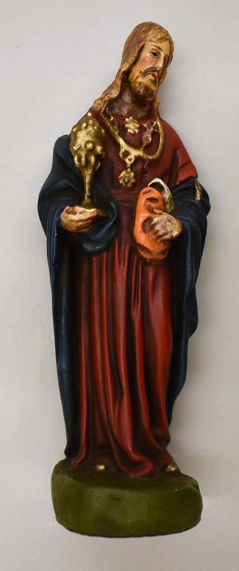 Staande koning Balthasar in rood gewaad en blauwe mantel met ciborie in rechter- en hoed in linkerhand