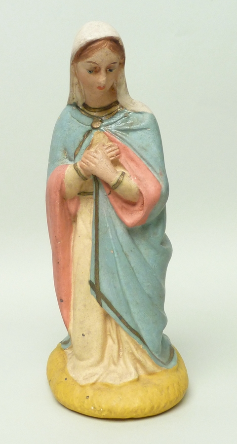 Knielende Maria in crème gewaad en blauwe mantel met roze omslag