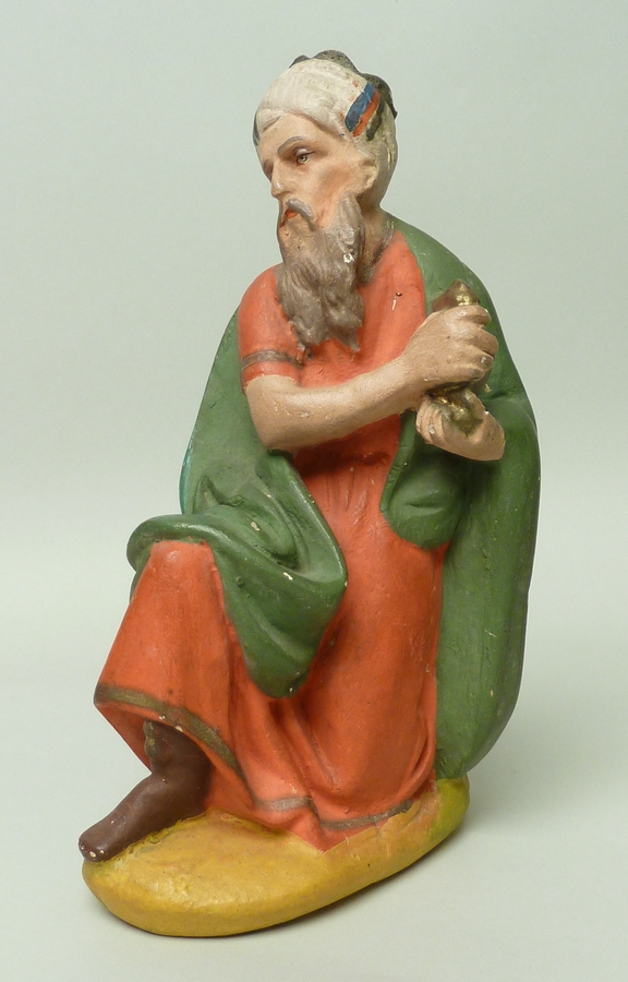 Knielende koning Melchior in rood gewaad en groene mantel met geschenk in handen