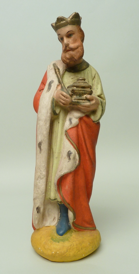 Staande koning Balthasar in lichtgroen gewaad en rode mantel met geschenk en scepter in handen