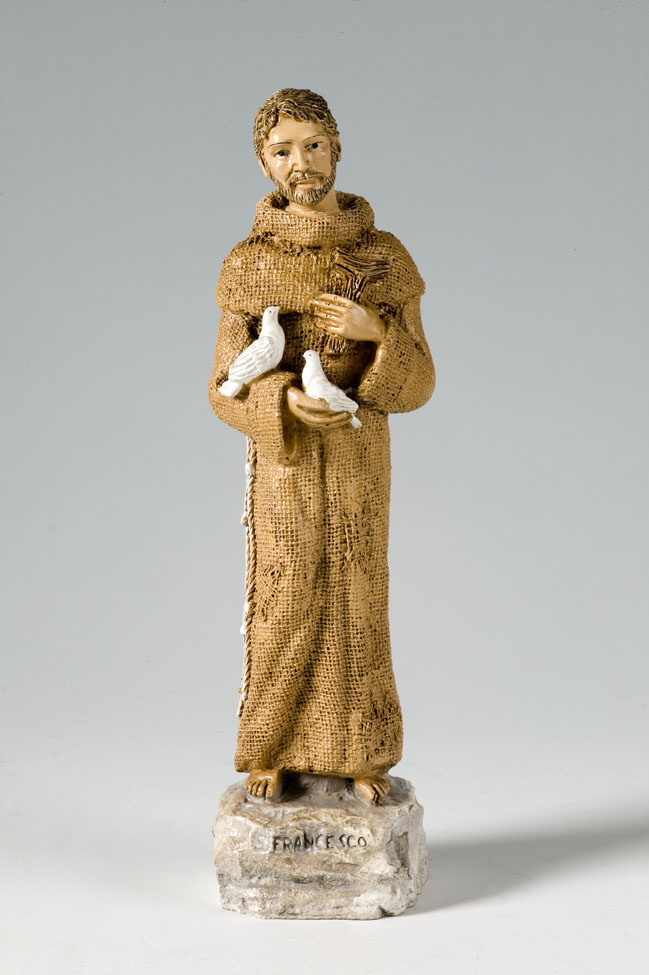 Franciscus van Assisi met duiven op rechterarm en staf in linkerhand