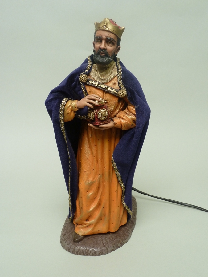 Staande koning Melchior in blauwe mantel, elektrisch aangedreven