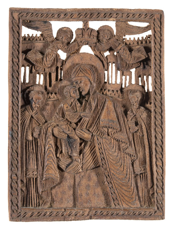 Snijwerk Moeder Gods Eleousa, in houten doosje zonder deksel
