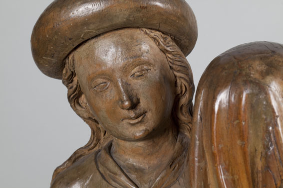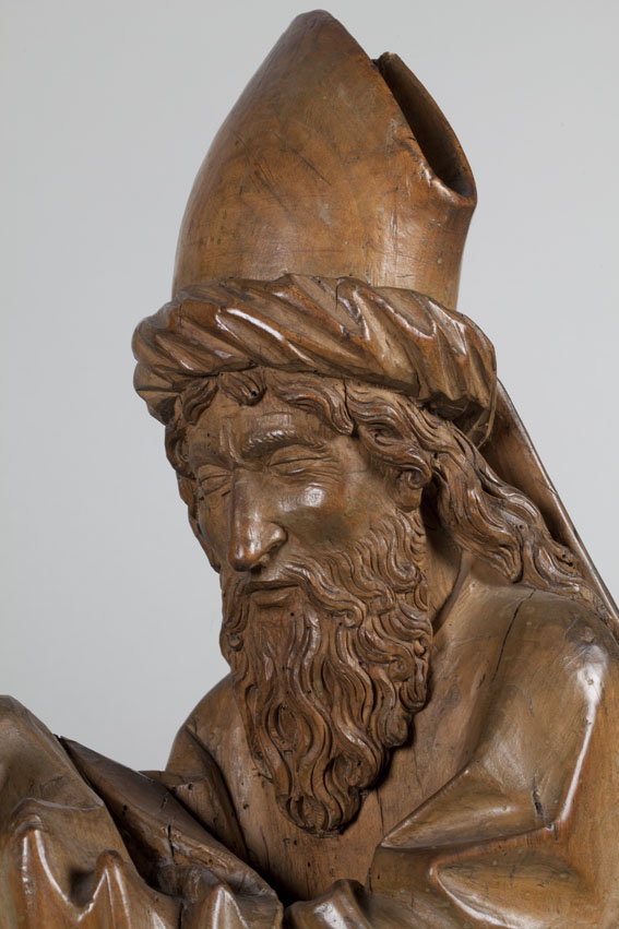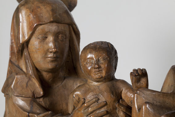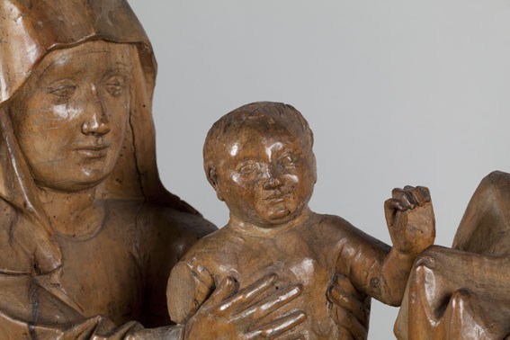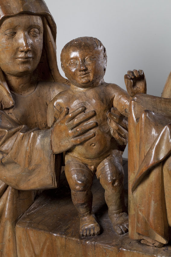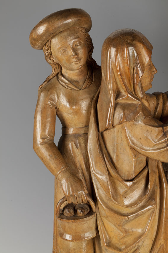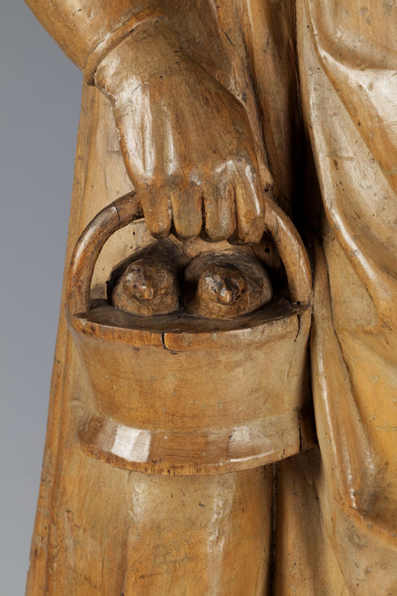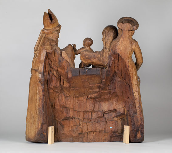 Opdracht in de tempel. Maria staat links en presenteert het kindje Jezus in de tempel aan de priester Simeon. Jezus staat op het altaar en steekt zijn handje naar Simeon uit. Achter Maria staat een dienares met in haar hand een mandje met twee duifjes. (Dit zijn de twee duifjes die Jozef meebracht naar de ...