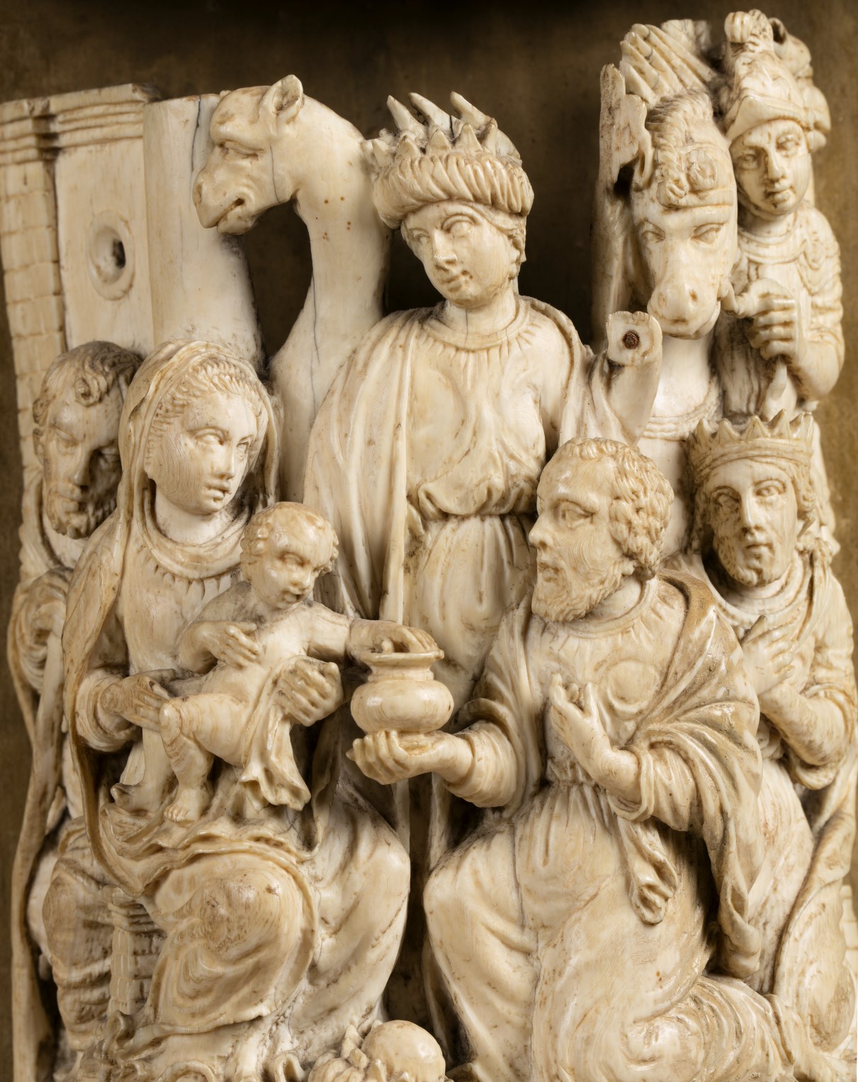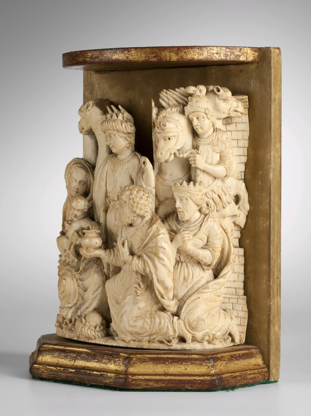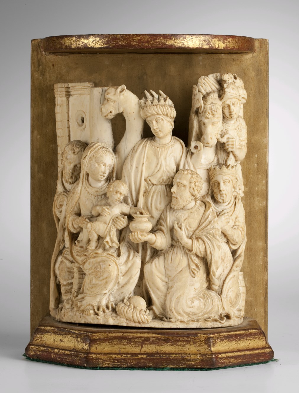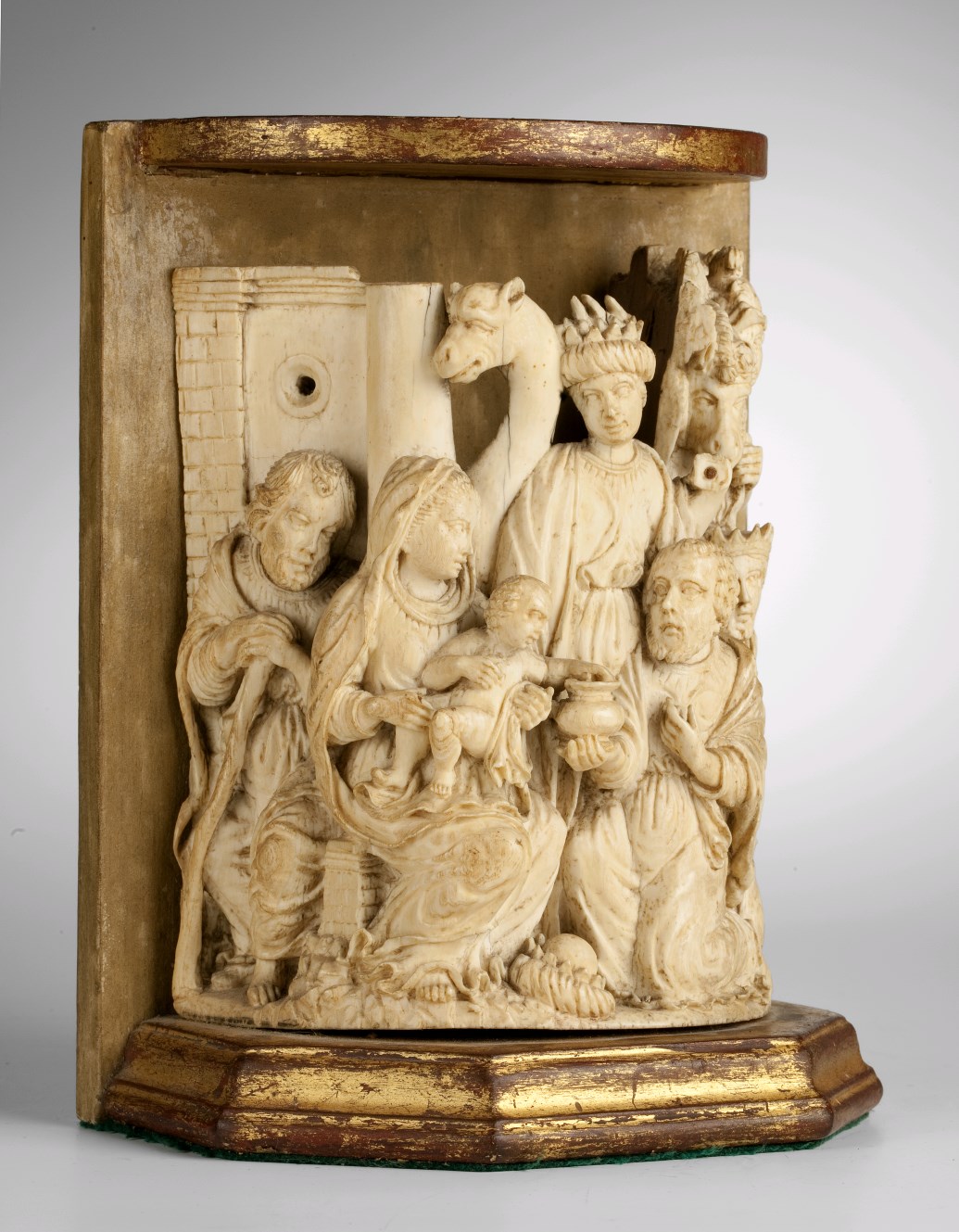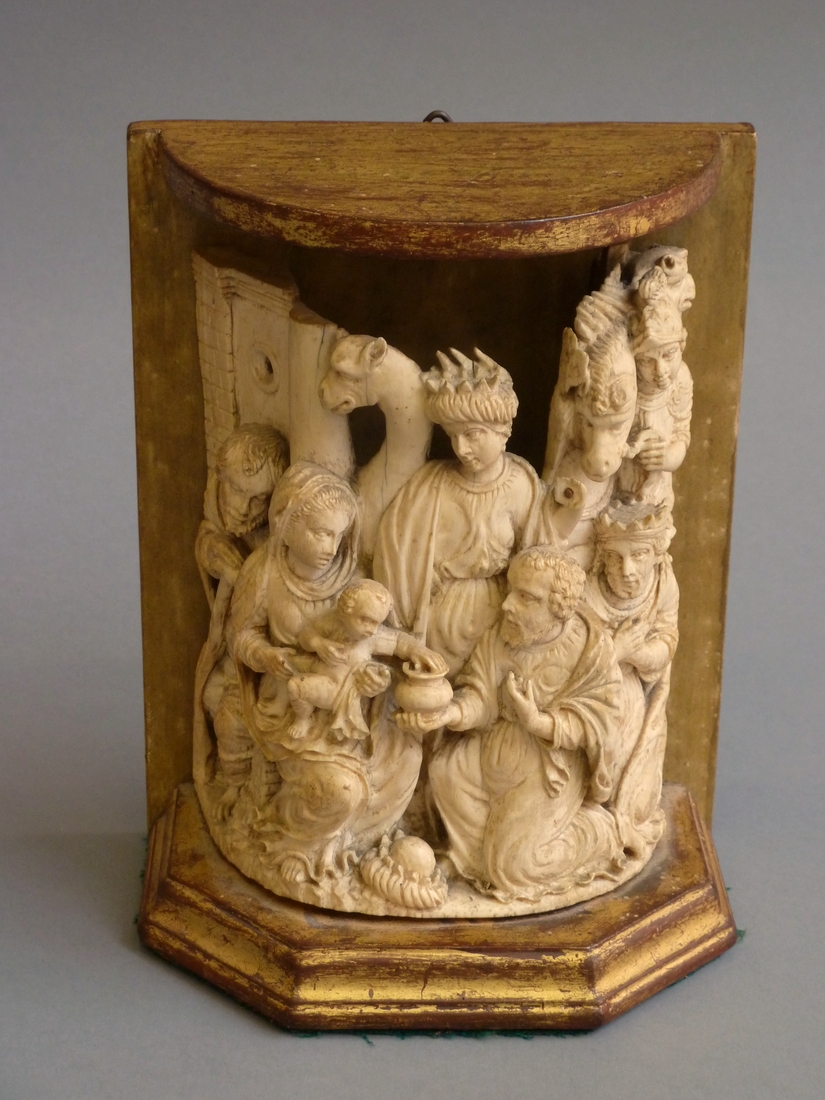 Reliëf met aanbidding der koningen, op houten sokkel met baldakijn