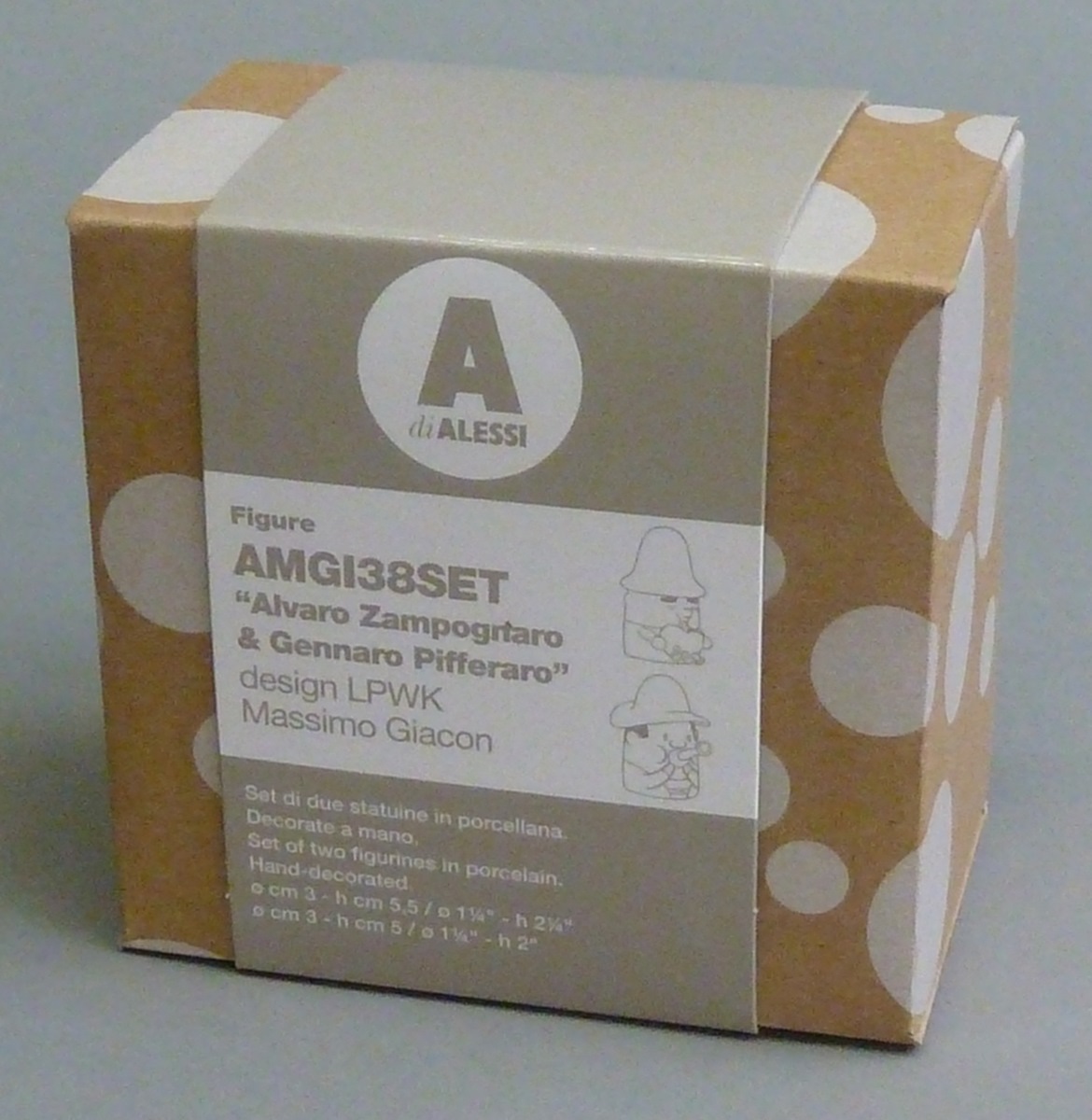 Kartonnen doos met stippen met "Alvaro Zampognaro & Gennaro Pifferaro" voor RMCC b298a en b uit kerstgroep