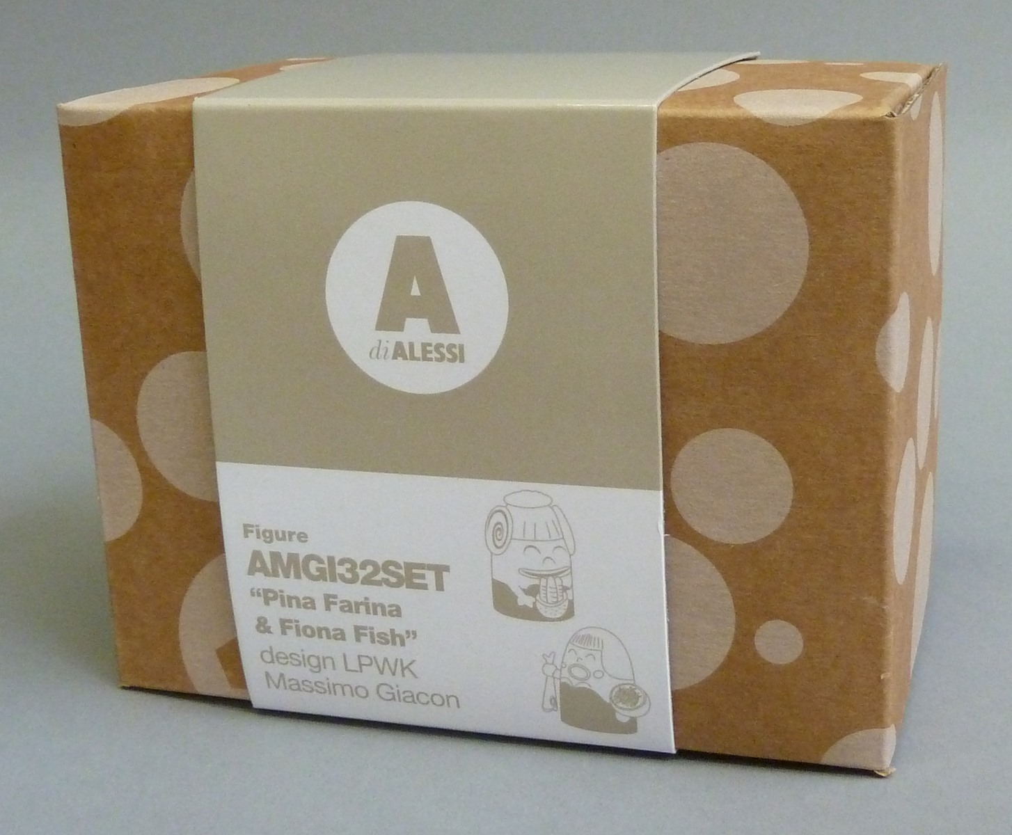 Kartonnen doos met stippen met "Pina Farina & Fiona Fish" voor RMCC b300a en b uit kerstgroep