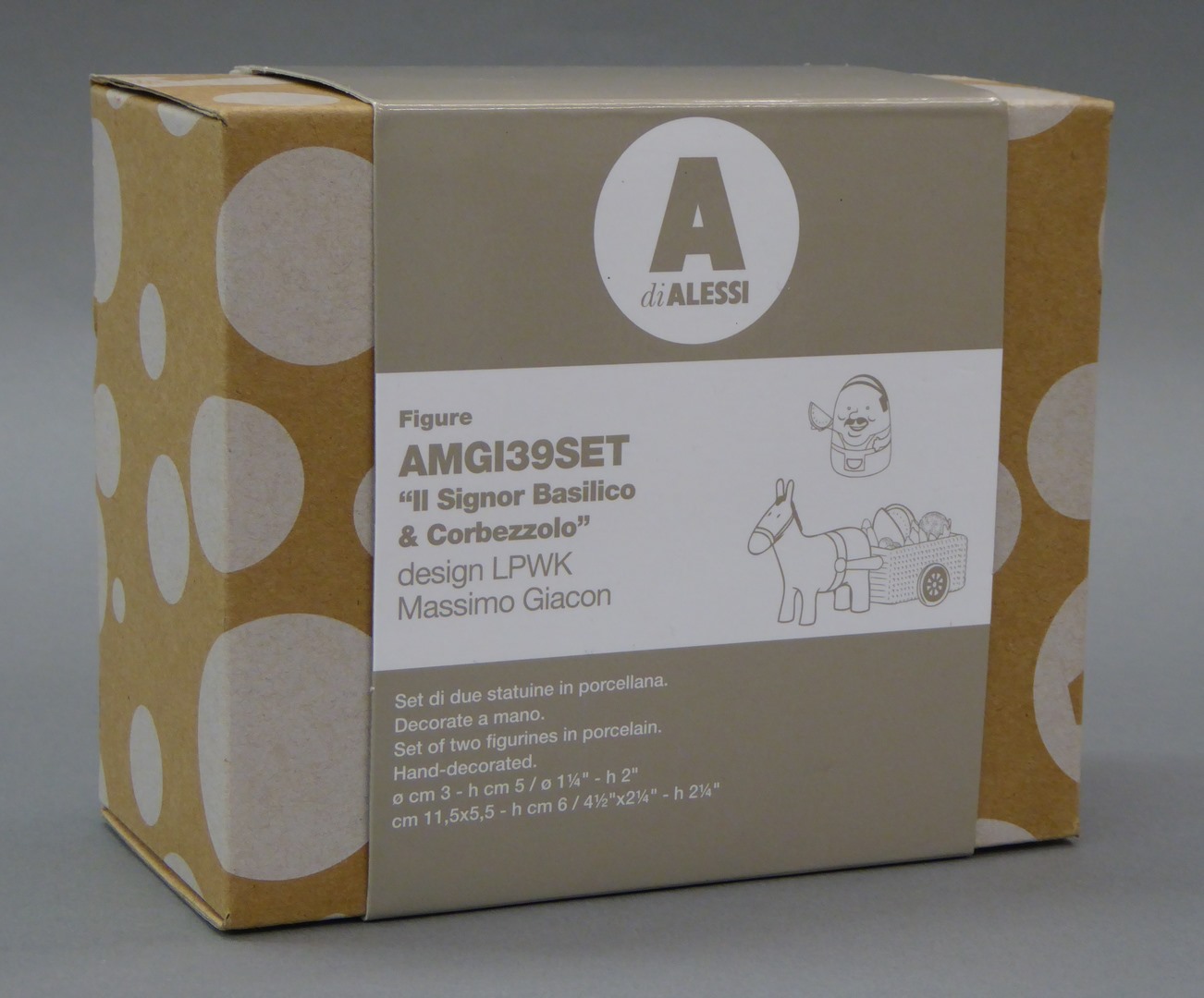 Kartonnen doos met stippen met "Il Signor Basilico & Corbezzolo" voor RMCC b307a en b uit kerstgroep