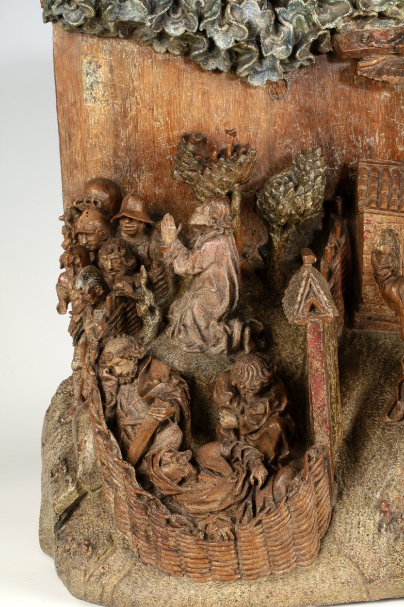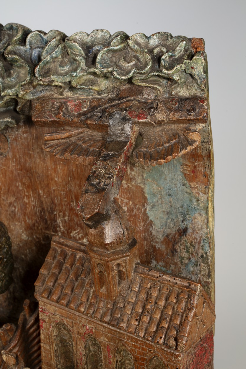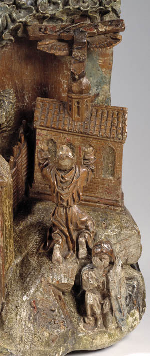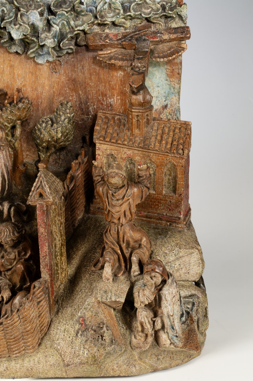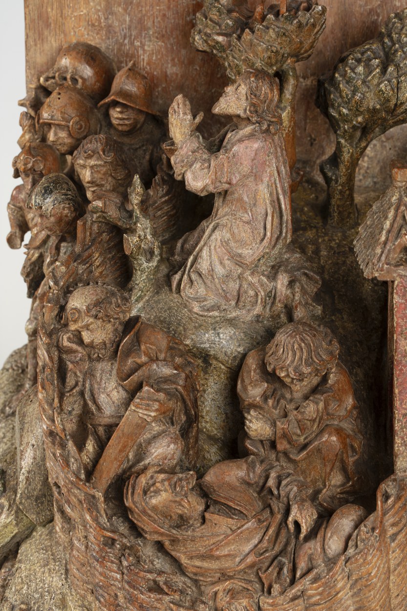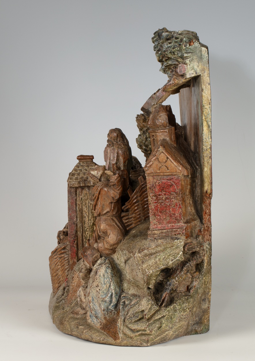 Op het linkerdeel van het reliëf is Christus in de Hof van Olijven afgebeeld, op het rechtergedeelte Franciscus die de stigmata ontvangt. In de omheinde Hof van Olijven is in het midden van de voorstelling de naar links geknielde, in gebed verzonken Christus afgebeeld. Hij heeft zijn handen in gebed gevouwen en kijkt omhoog, waarschijnlijk ...