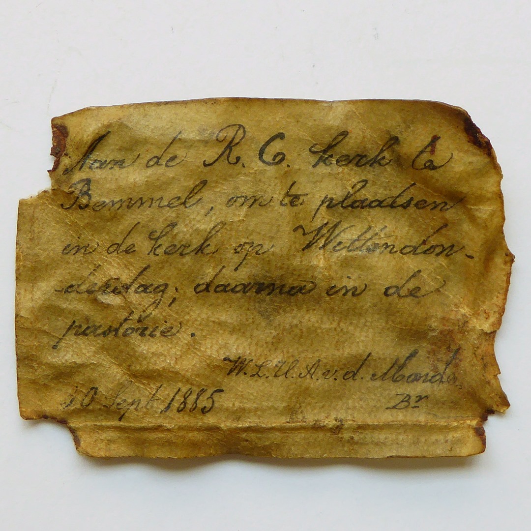 De tekst op het perkament luidt: 'Aan de R.C. kerk te Bemmel, om te plaatsen in de kerk op Wittendonderdag; daarna in de pastorie. W.L.H.A. v.d. Monde Bv. 30 Sept. 1885'.
