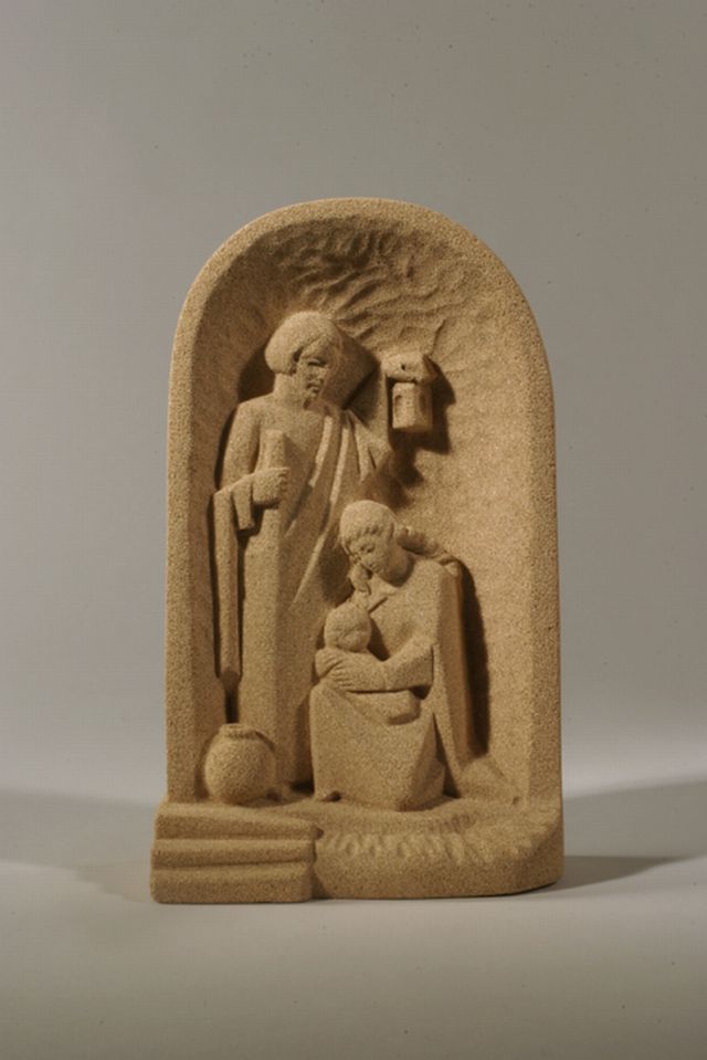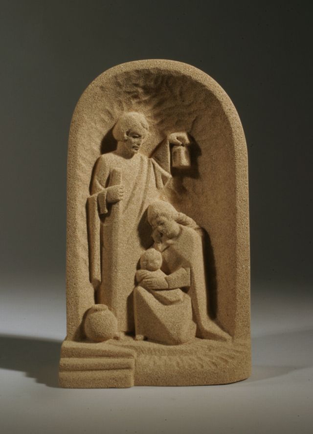 Kerstgroep in reliëf, Maria, Jozef, Christuskind gesitueerd in nis, licht bruin