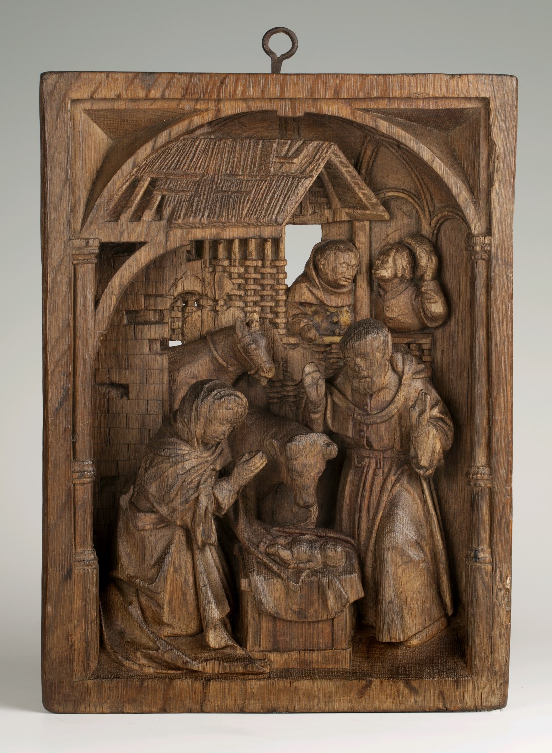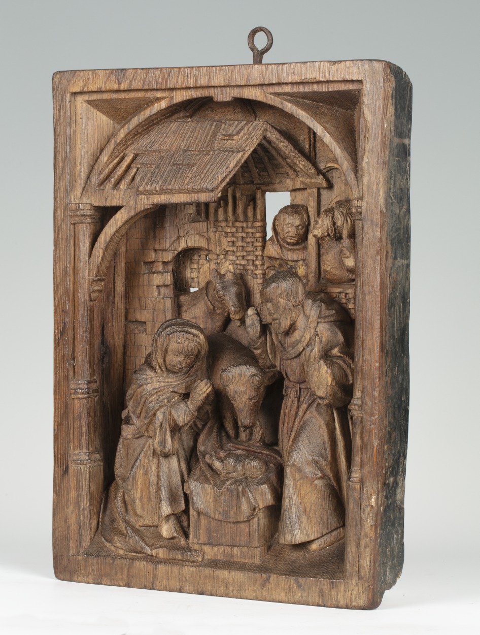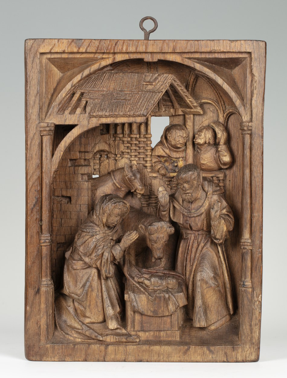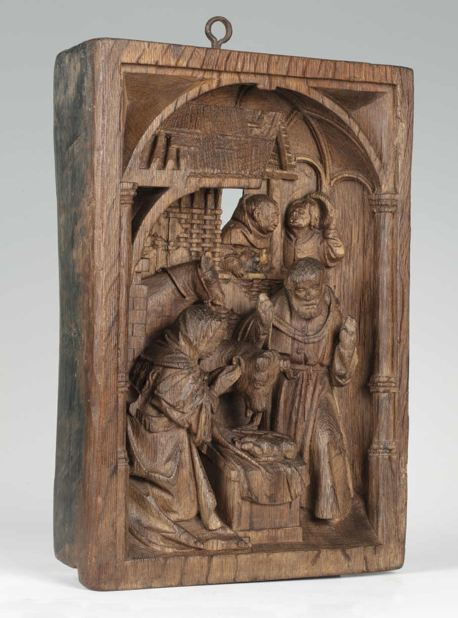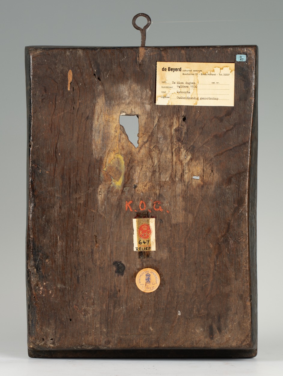 In een rechthoekige omlijsting waarin aan de bovenzijde een netgewelf, dat aan weerszijden rust op twee zuilen, is de geboorte van Christus voorgesteld. Onder het strodak van een vervalllen stal, knielt links Maria in aanbidding voor het naakte kind, dat op een slip van haar mantel op een stenen kribbe ligt. Jozef staat rechts met ...