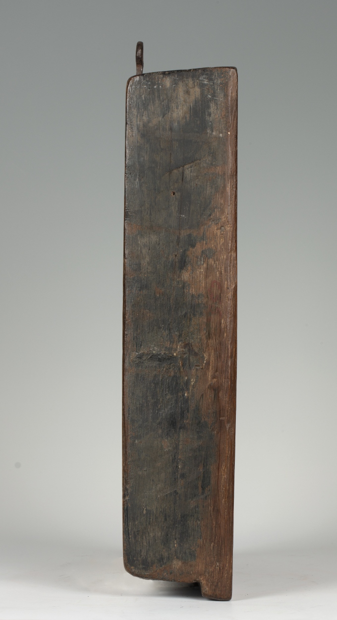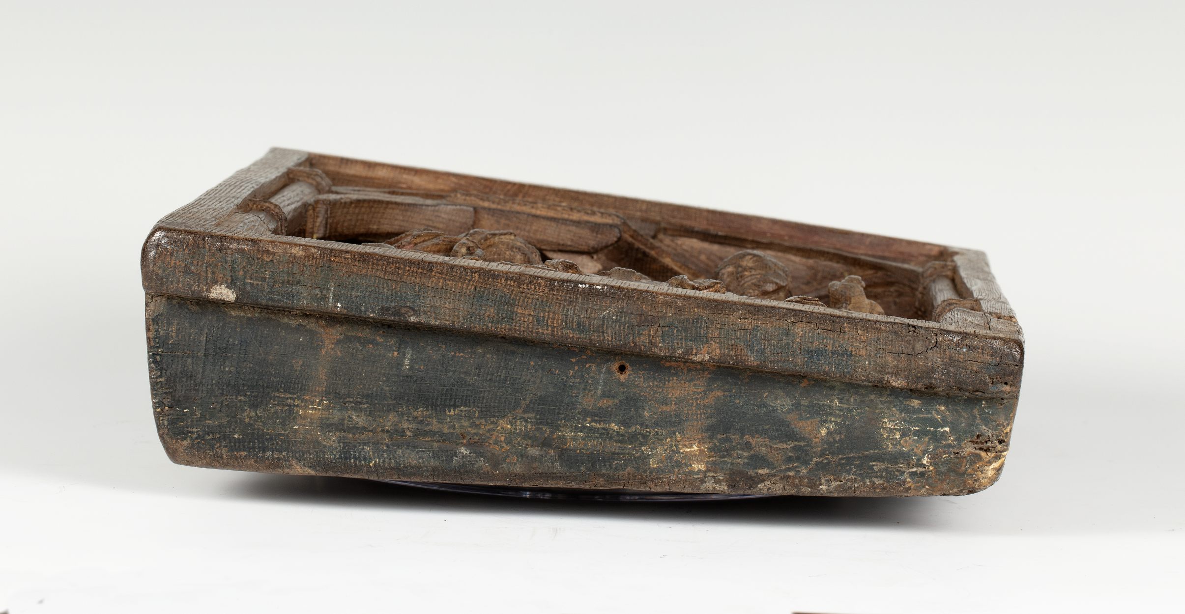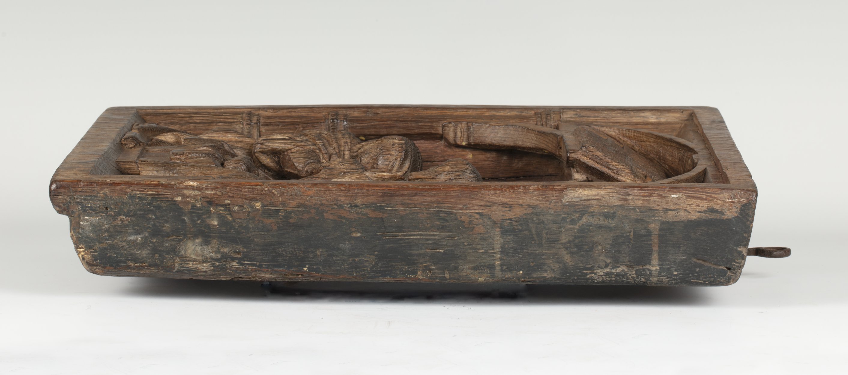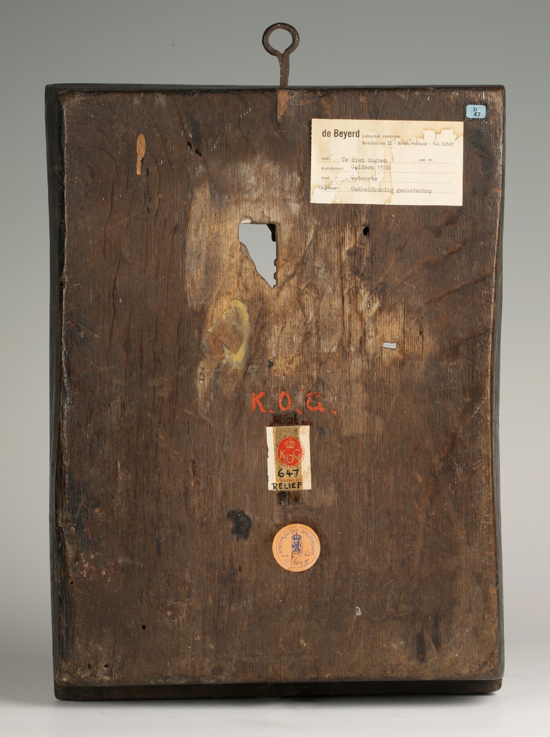 In een rechthoekige omlijsting waarin aan de bovenzijde een netgewelf, dat aan weerszijden rust op twee zuilen, is de geboorte van Christus voorgesteld. Onder het strodak van een vervalllen stal, knielt links Maria in aanbidding voor het naakte kind, dat op een slip van haar mantel op een stenen kribbe ligt. Jozef staat rechts met ...