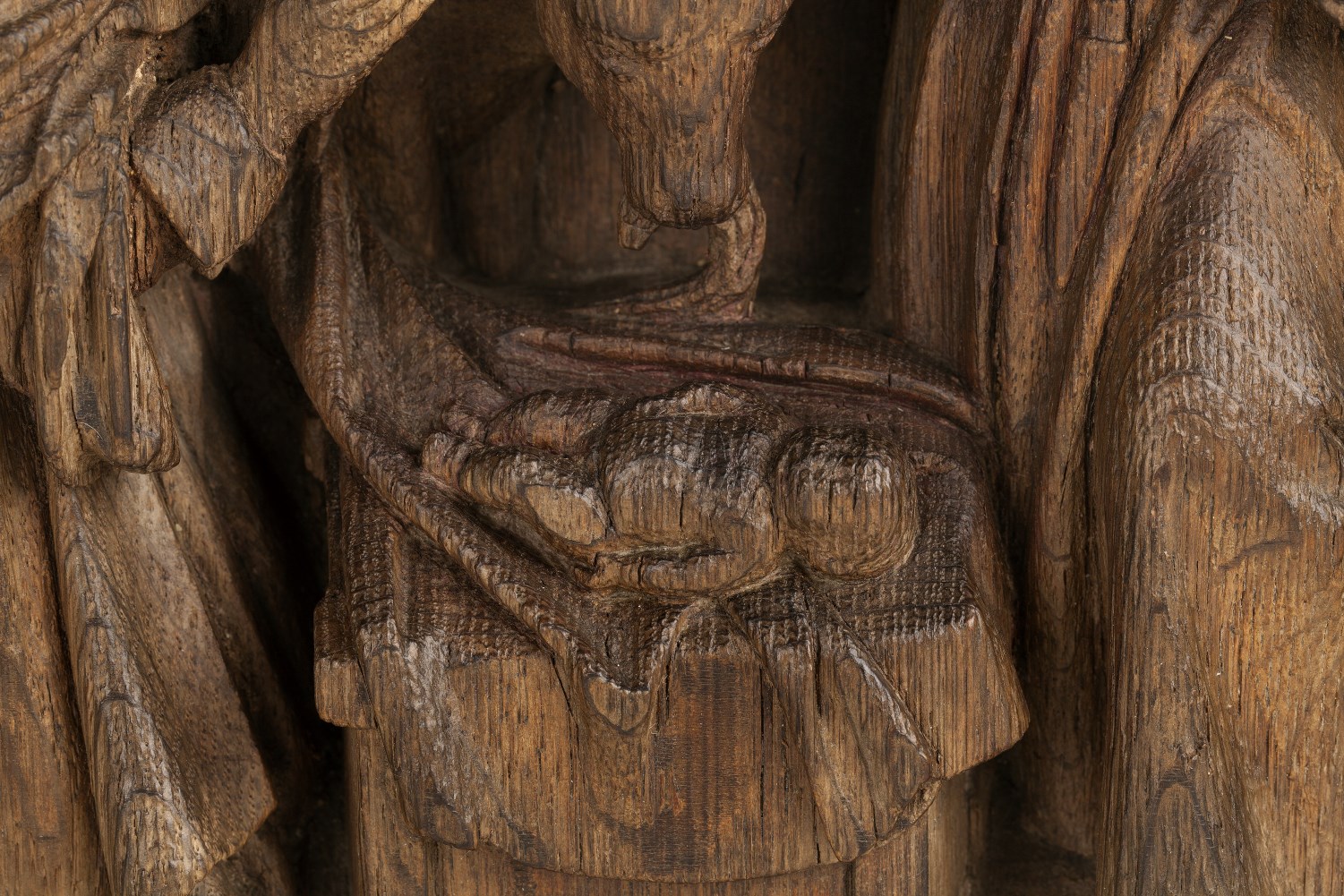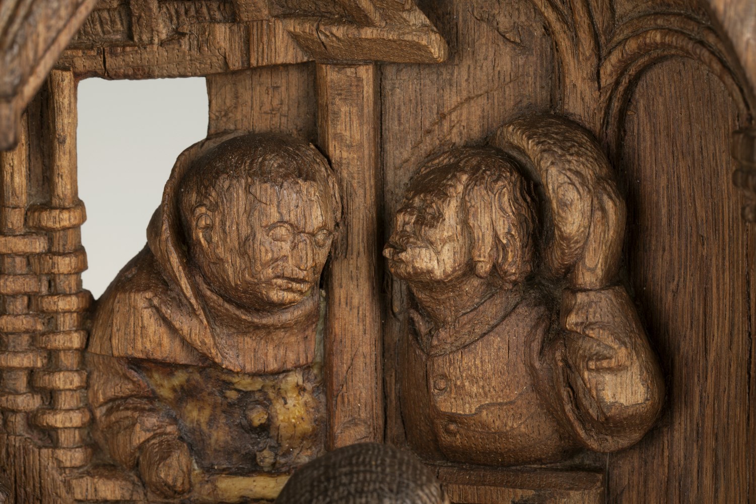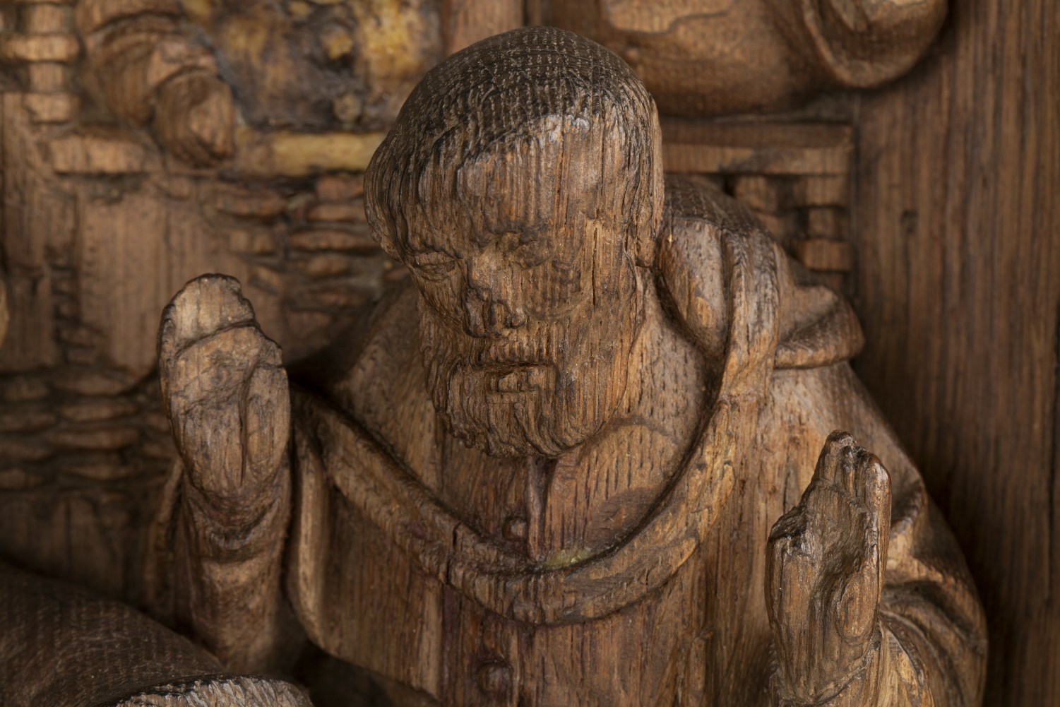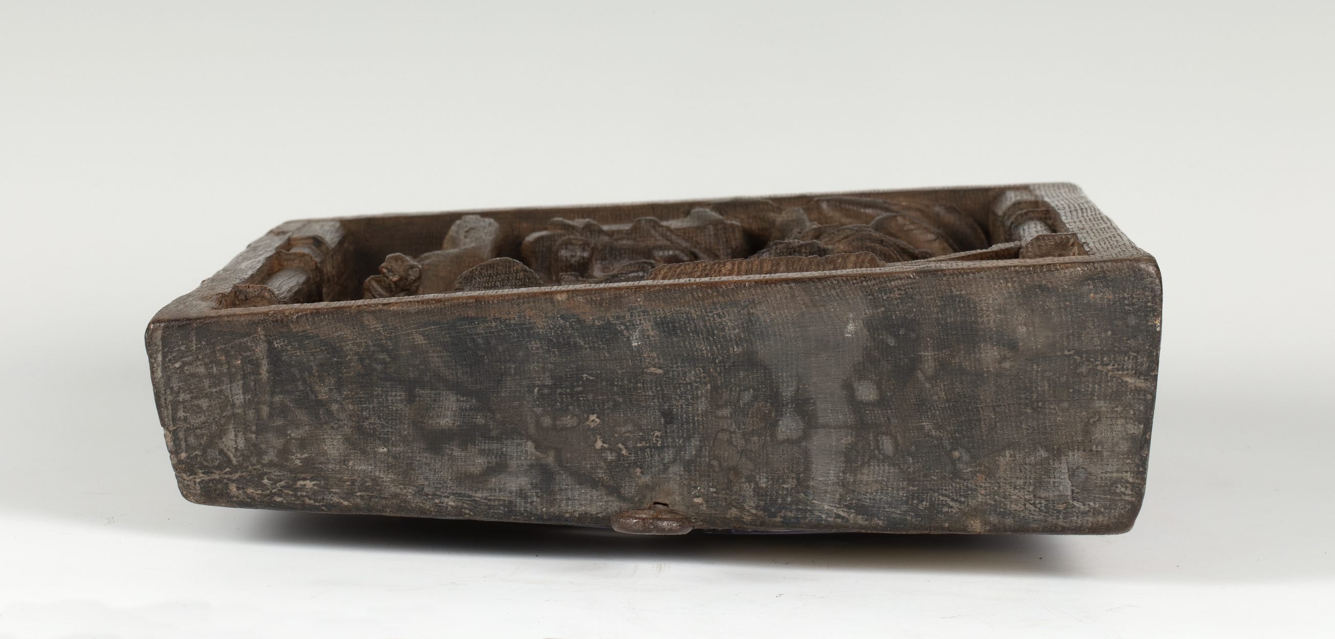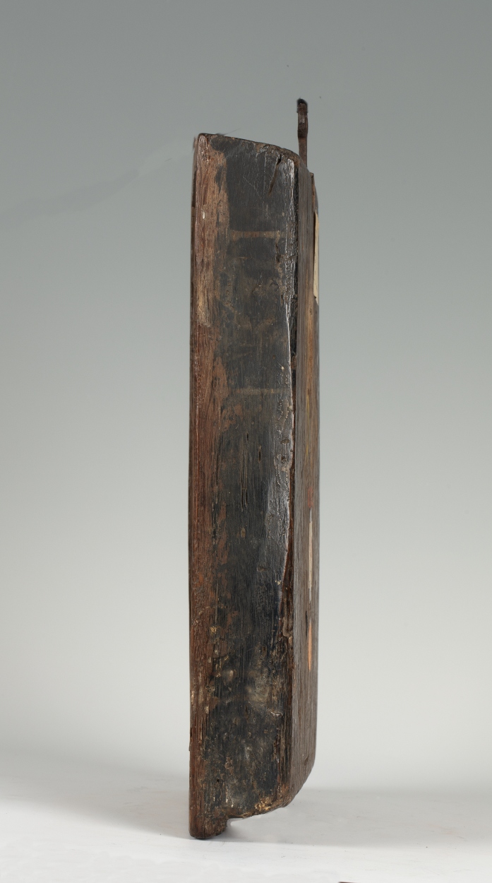In een rechthoekige omlijsting waarin aan de bovenzijde een netgewelf, dat aan weerszijden rust op twee zuilen, is de geboorte van Christus voorgesteld. Onder het strodak van een vervalllen stal, knielt links Maria in aanbidding voor het naakte kind, dat op een slip van haar mantel op een stenen kribbe ligt. Jozef staat rechts met ...