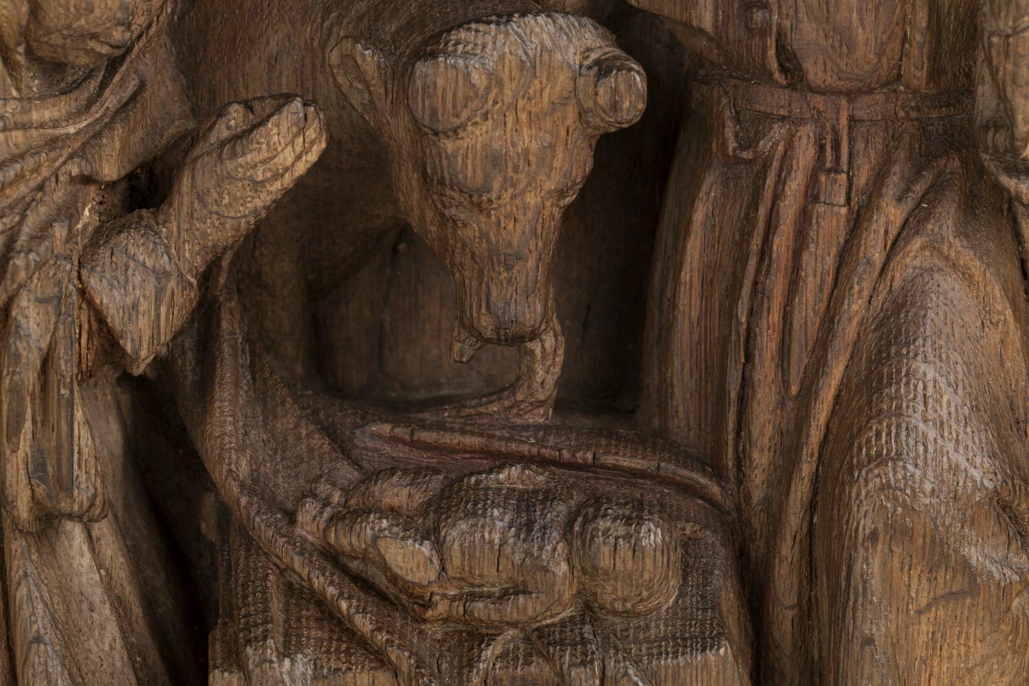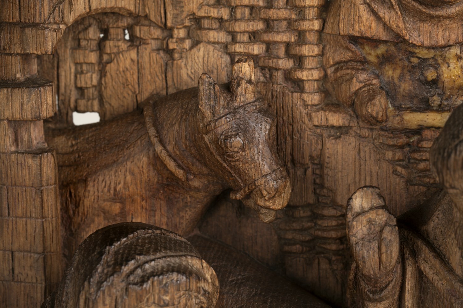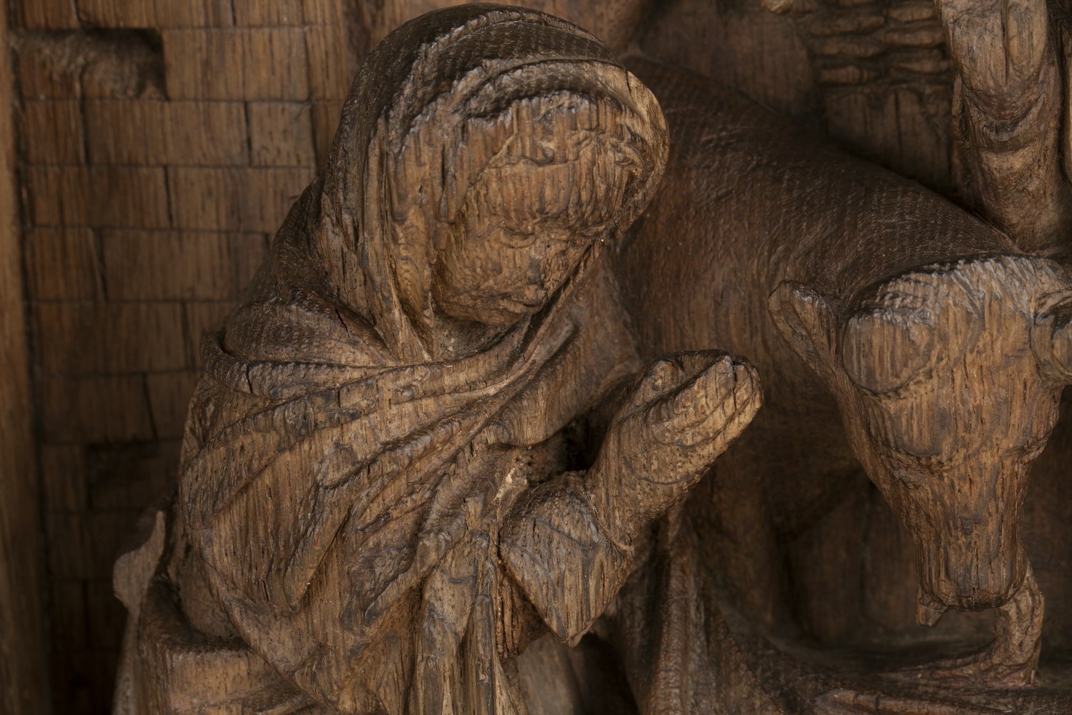 Geboorte van Christus in stal met Maria en Jozef, os, ezel, herders