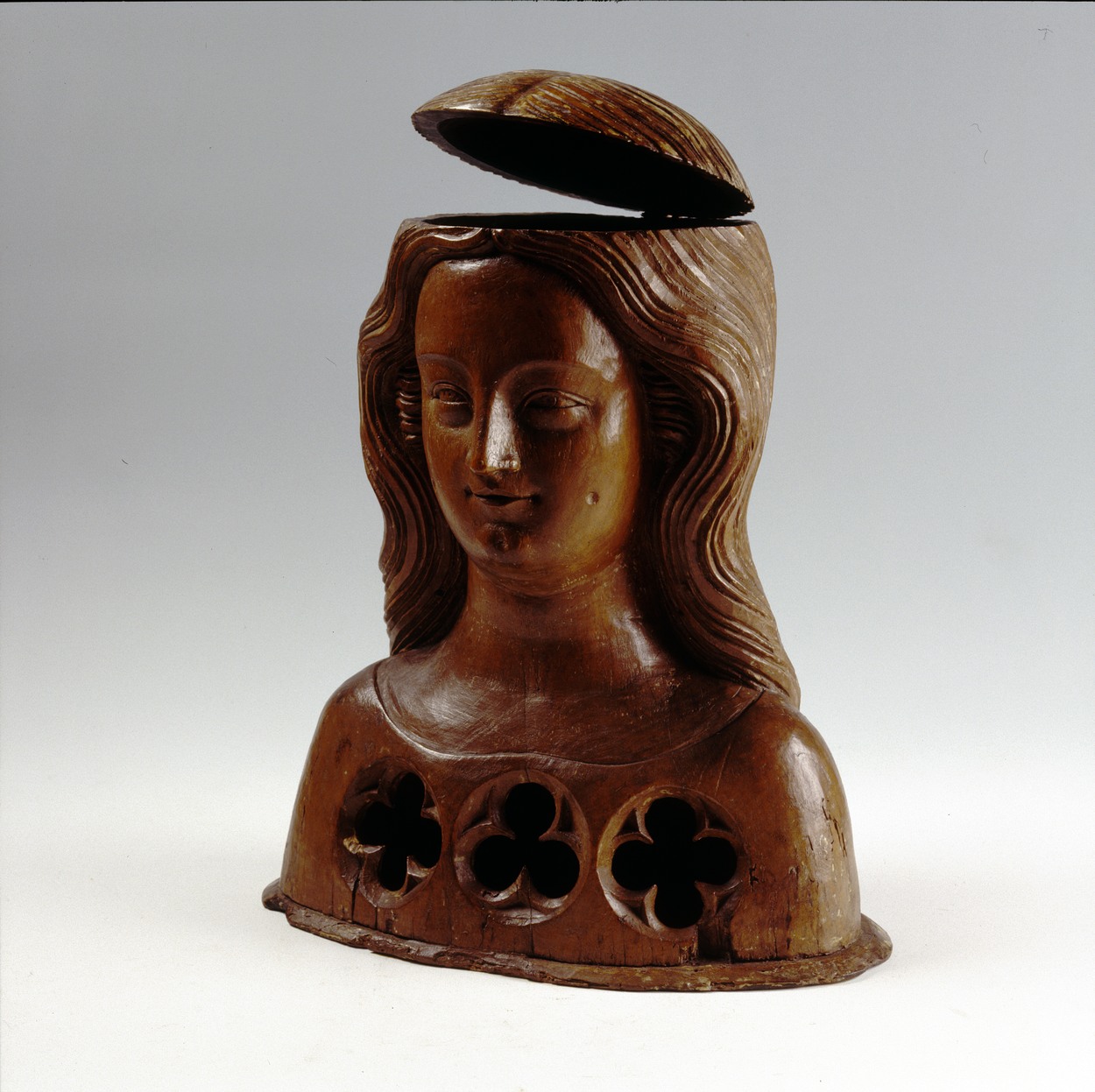 De gezellin van de Heilige Ursula is als borstbeeld, frontaal voorgesteld. Rond haar ovale, glimlachende gelaat liggen evenwijdig golvende haarstrengen tot over haar schouders. Ter hoogte van de oren korte, dwarse lokken. Zij heeft een rechte neus, smalle, halve-maanvormige ogen en kuiltjes in wangen en kin. Het schedeldak kan van voren opgeklapt worden en heeft ...