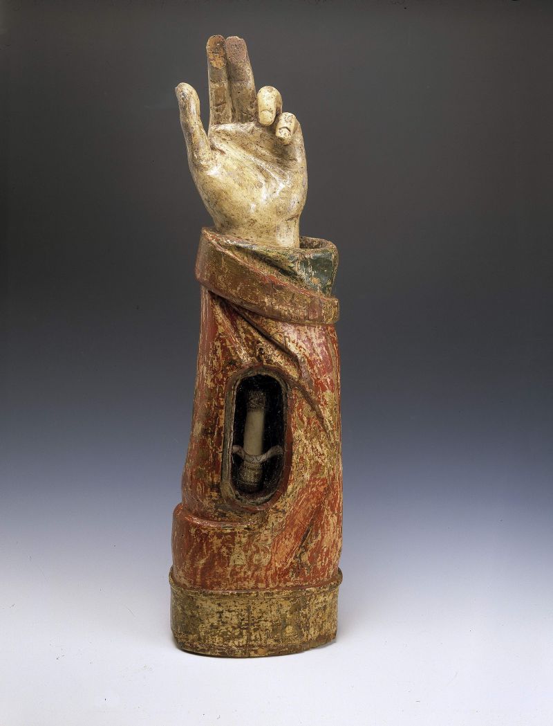 De ongeveer levensgrote arm staat rechtop, met de zegenende rechterhand naar de beschouwer gekeerd. De arm is gehuld in een mouw met teruggezakte, omgeklapte boord. In de stof een paar diagonale, ondiepe plooien. Langs de onderkant van de arm een soort sokkelzone afgezet met een profielrandje. In het midden van de voorzijde is een ovale ...