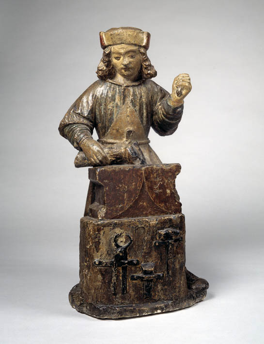 Gildebeeld van Eloy als hoefsmid bij aambeeld met paardenbeen