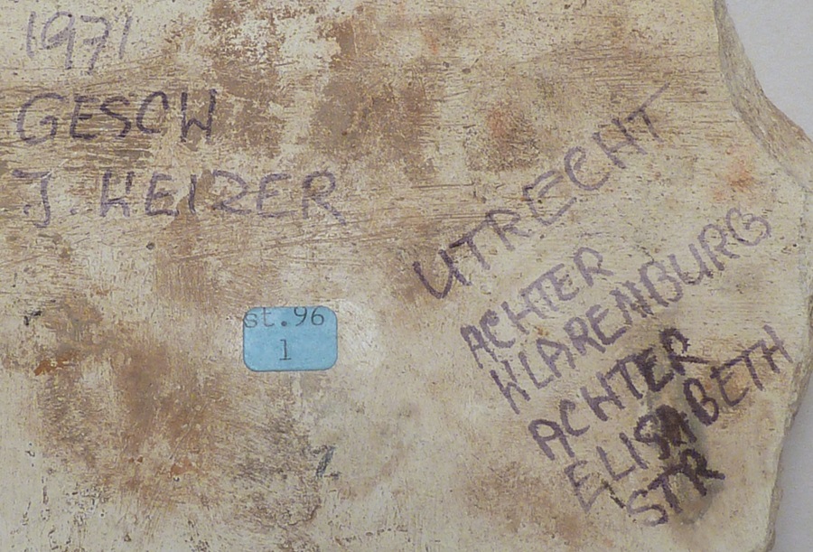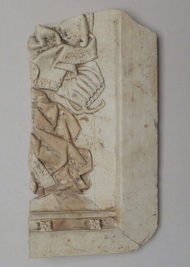 Fragment onderzijde annunciatiereliëf, als ABM bs712 en replica RMCC b83, vondst Utrecht
