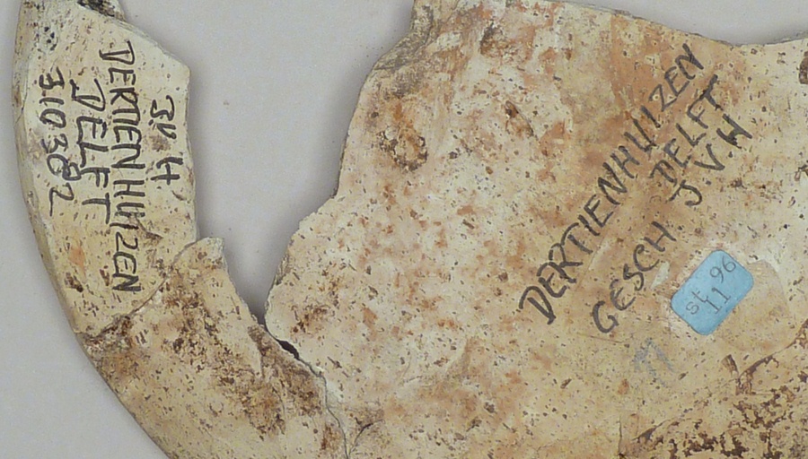 Onderste deel rond reliëf met omlijsting waarop Anna-te-drieën, zittend, vondst Delft