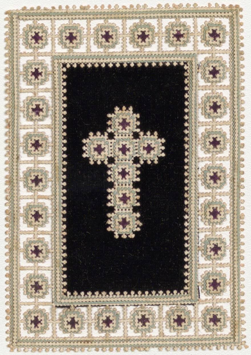 H. Kruis op zwart fluweel, met opengewerkte rand van kruisjes, van stramienkarton