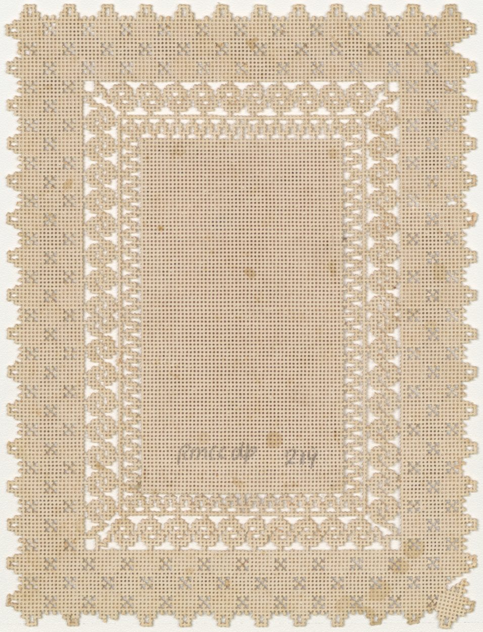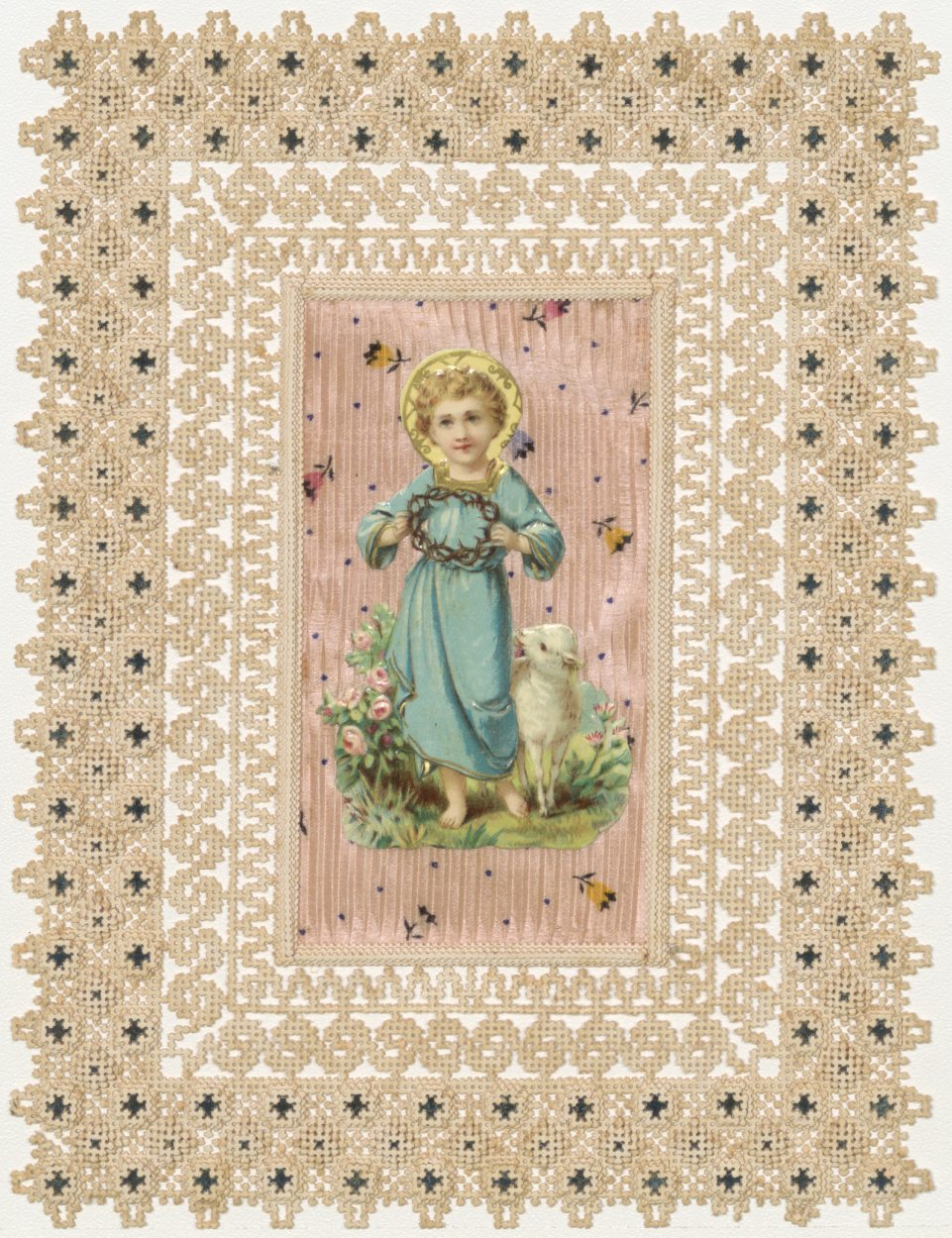 Christuskind met lam en doornenkroon in de handen, geplakt op textiel met lijstwerk van stramienkarton