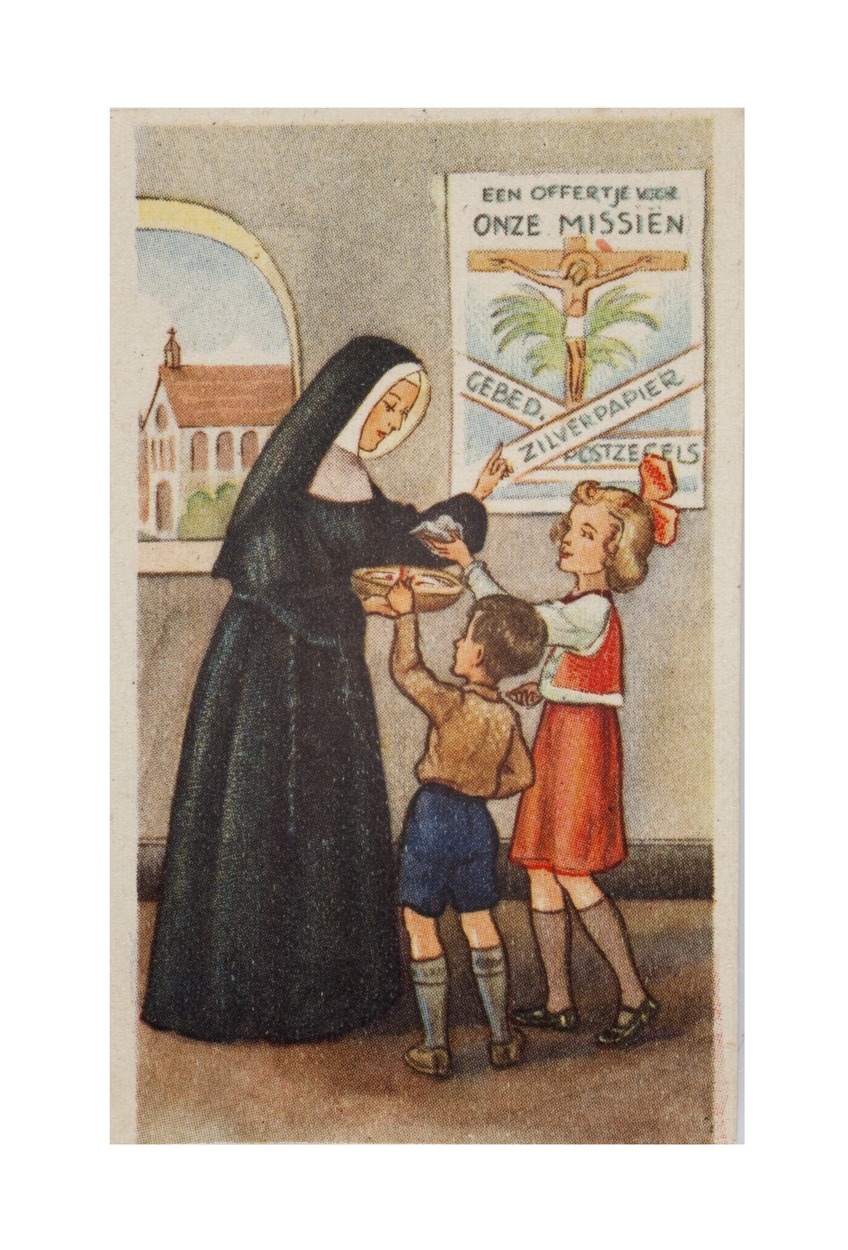 Missieprentje waarop twee kinderen die non een offertje brengen en wandplaat met "een offertje voor onze missiën gebed. zilverpapier postzegels"
