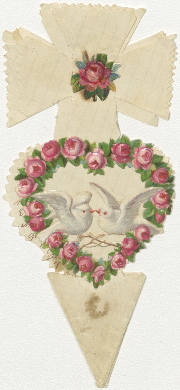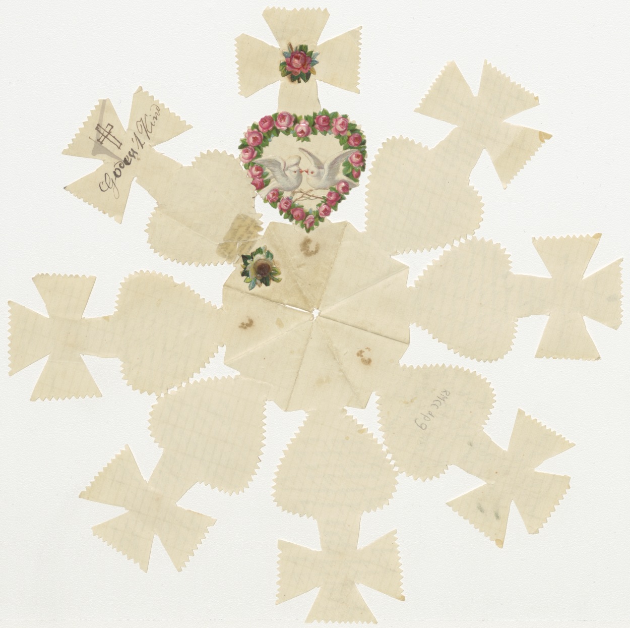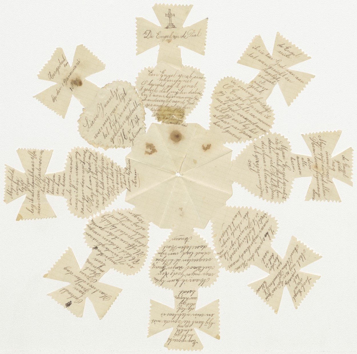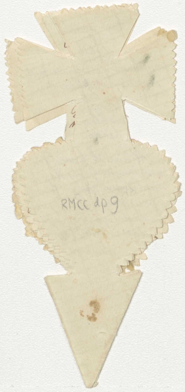 Gevouwen knipsel in vorm van hart waarop kruis met geschreven teksten en gebeden, kz. tekst
