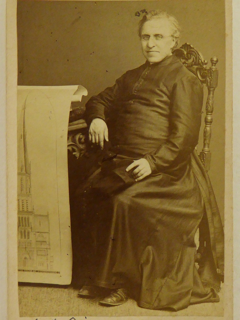 Portret van J.J. Rioche, zittend, met tekening van kerk