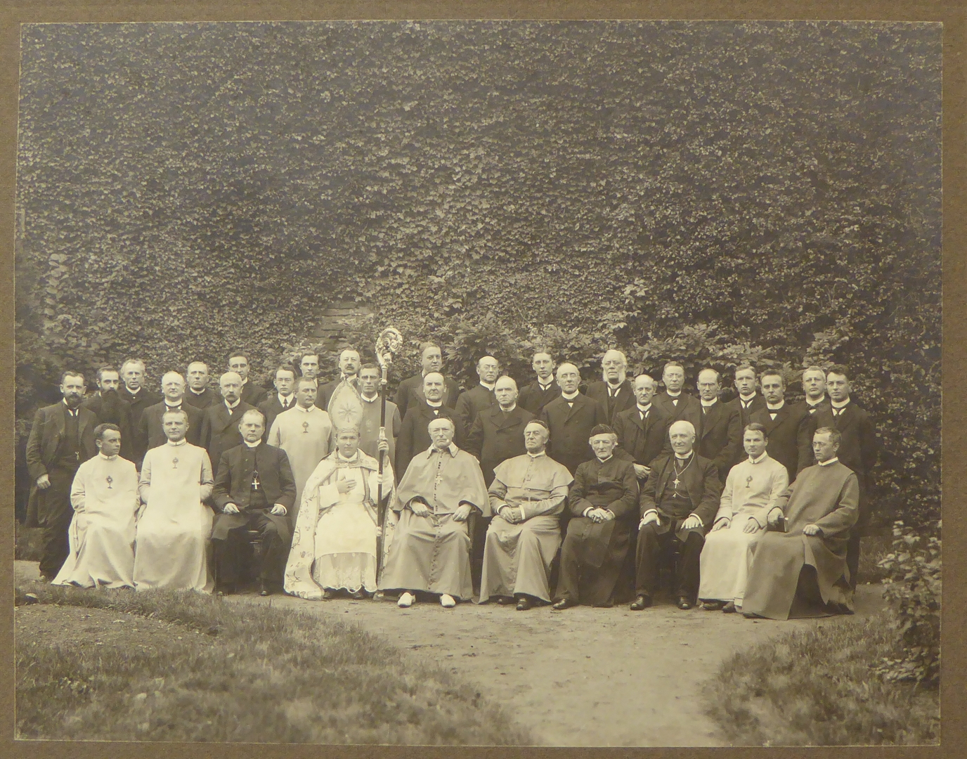 Groepsportret met Mgr. Rinkel, achtergrond een met klimop begroeide muur