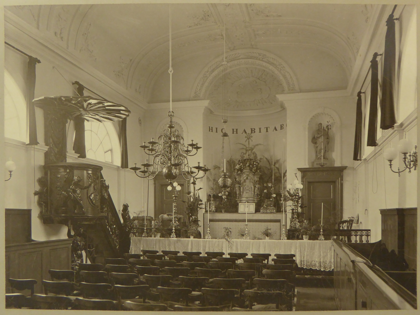 Interieur van kerk te Dordrecht, zicht op preekstoel en altaar