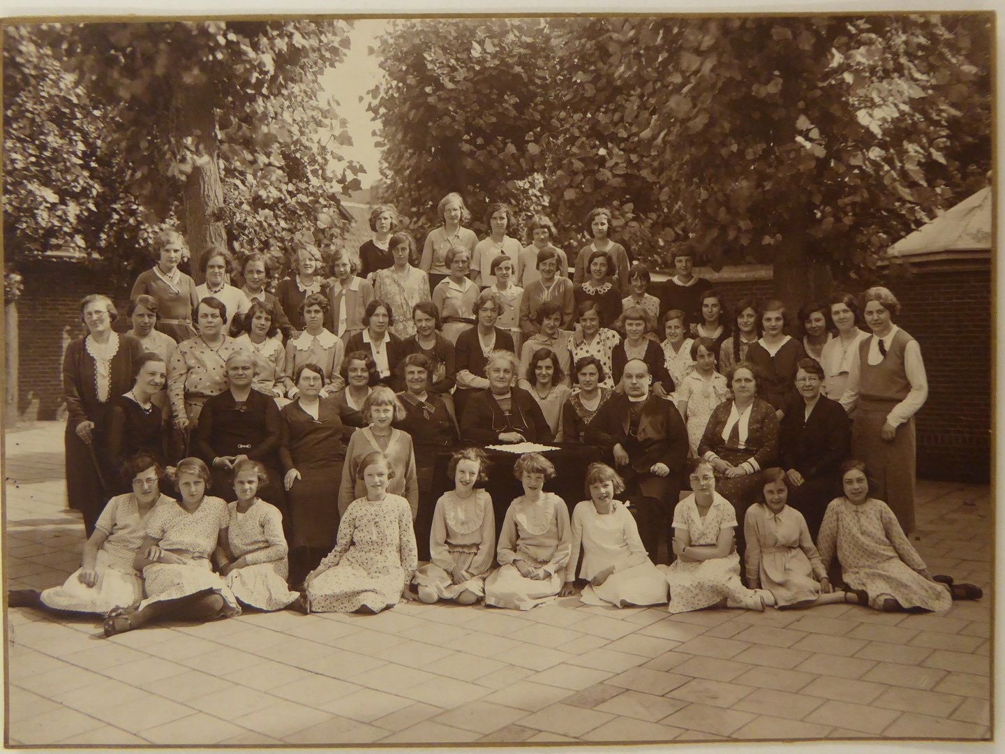 Groepsportret van meisjes en vrouwen met pastoor