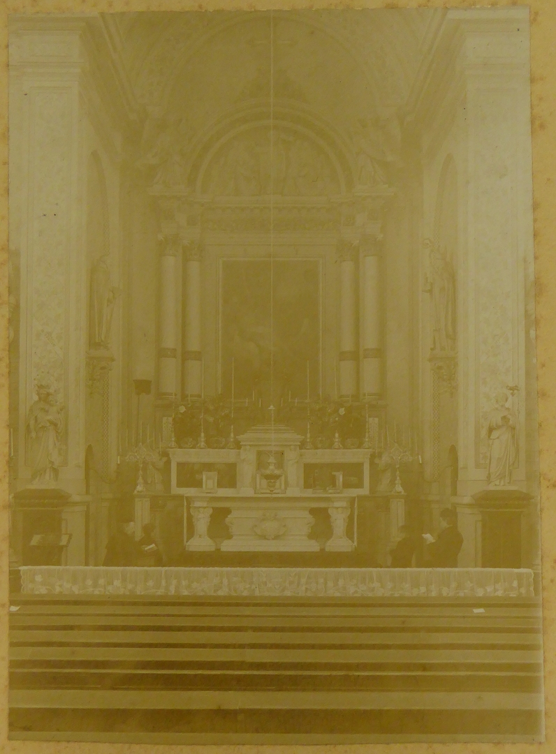 Interieur van R.K. kerk te Delftshaven(?) met pastoor J. Brouwer op het altaar