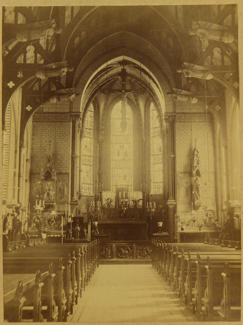 Interieur van de kapel van het Ursulinenklooster Jerusalem te Venray, zicht naar het altaar, engelen in dakconstructie