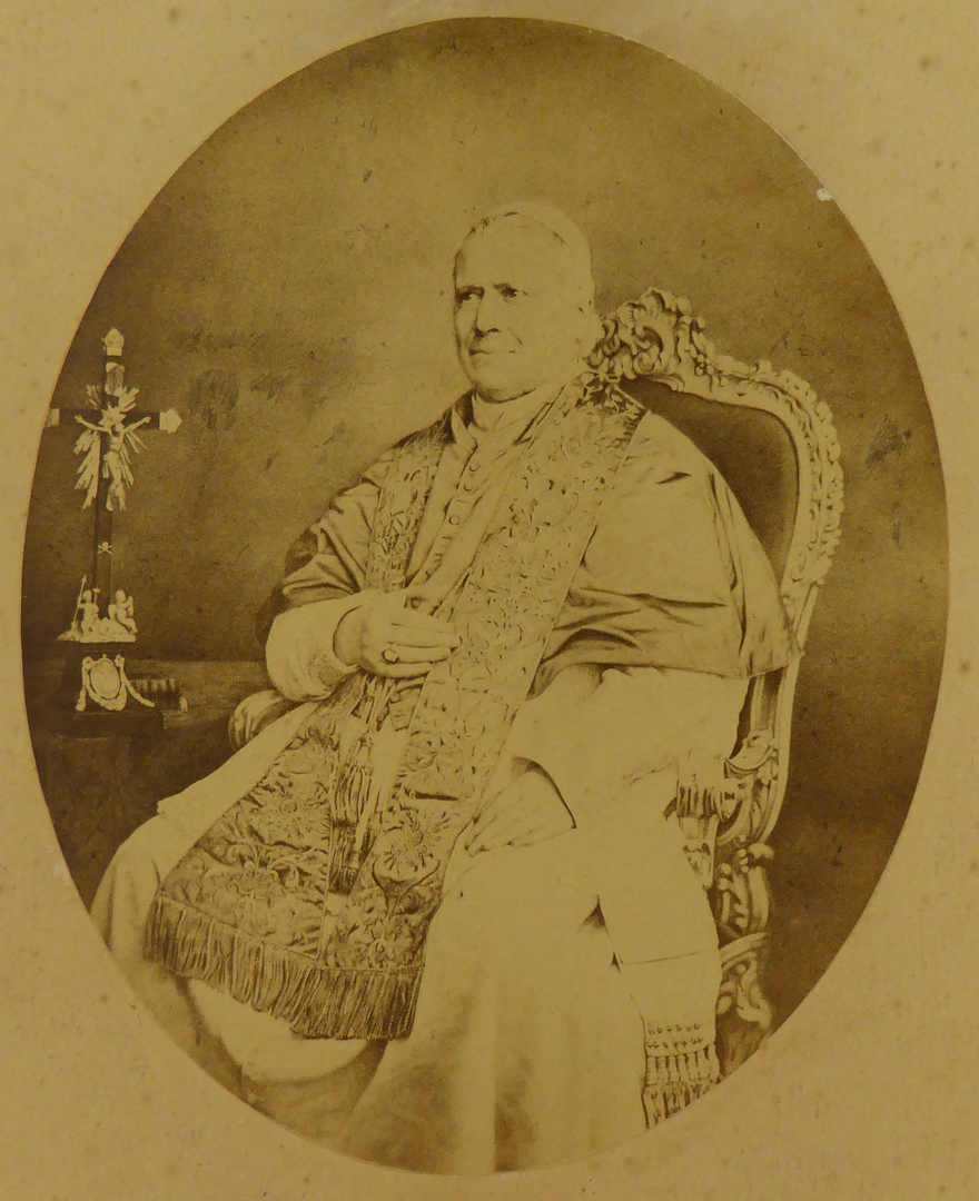 Portret van paus Pius IX, zittend, bij kruisbeeld