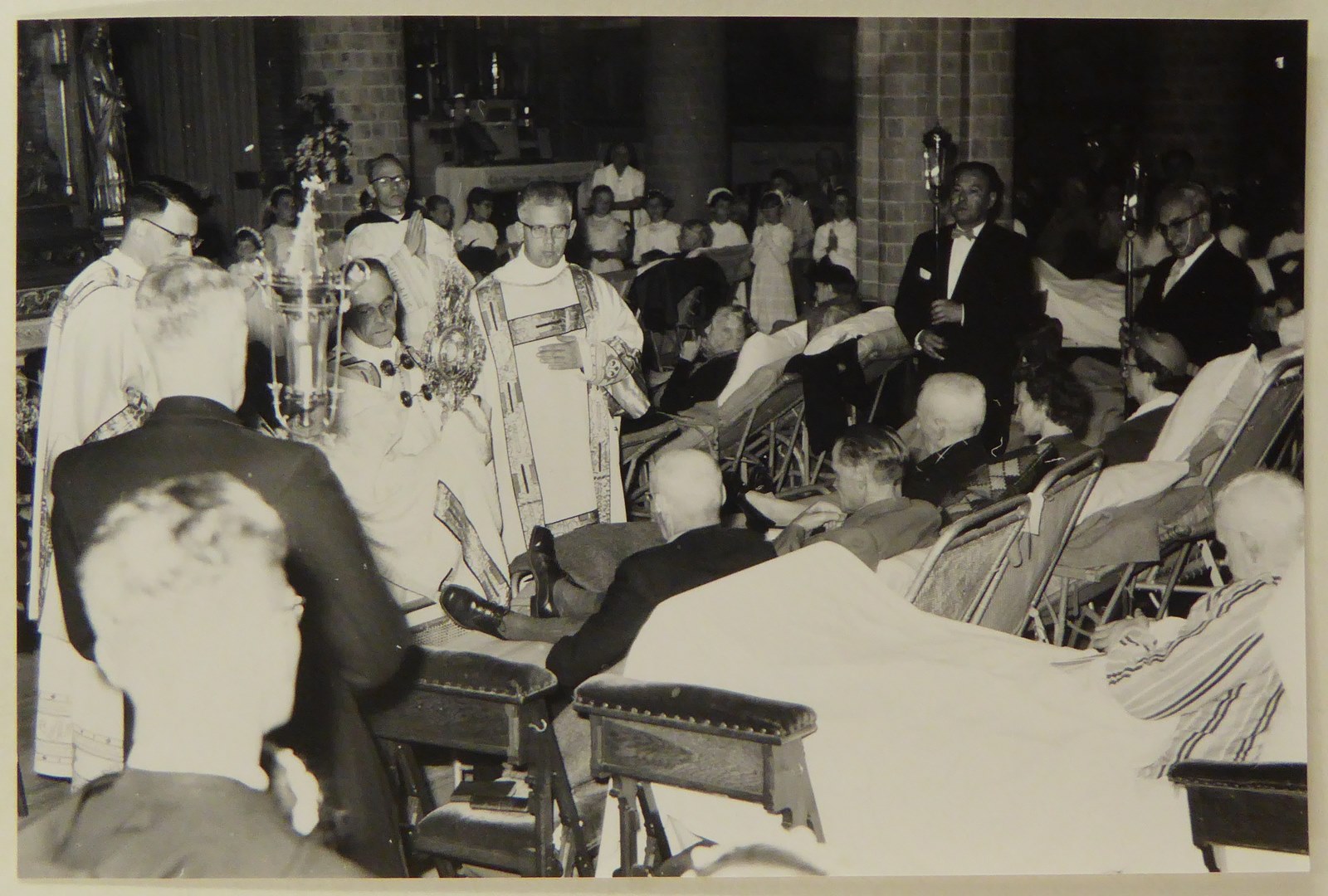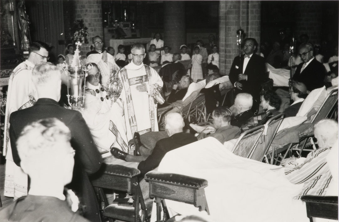 H. Mis in de Monicakerk te Utrecht, ziekentriduüm met prior Gelsing, knielende met monstrans. De zieken worden gezegend met het Allerheiligste.