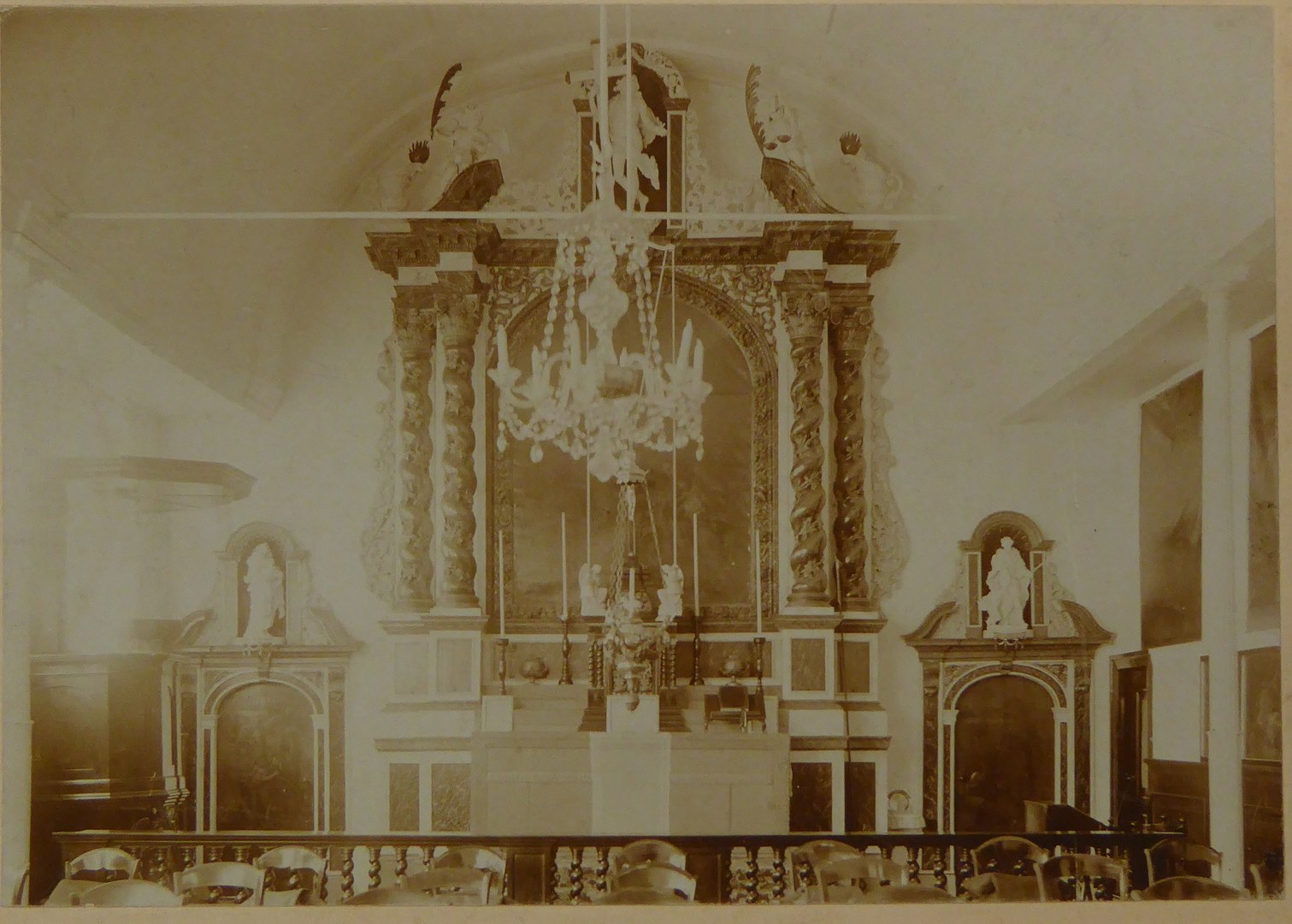 Interieur van de Oude Kerk te Leiden met zicht op het altaar