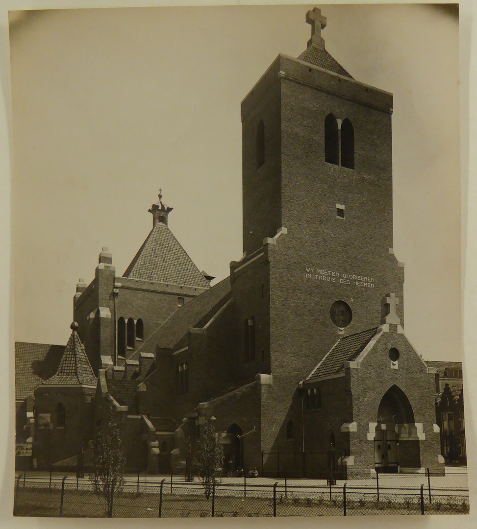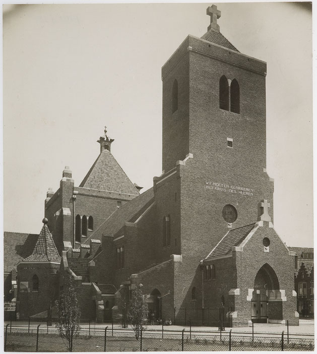 Exterieur van de Antonius Abt kerk (architect Kropholler) te Delfshaven, afgebroken in 1973, voorzijde