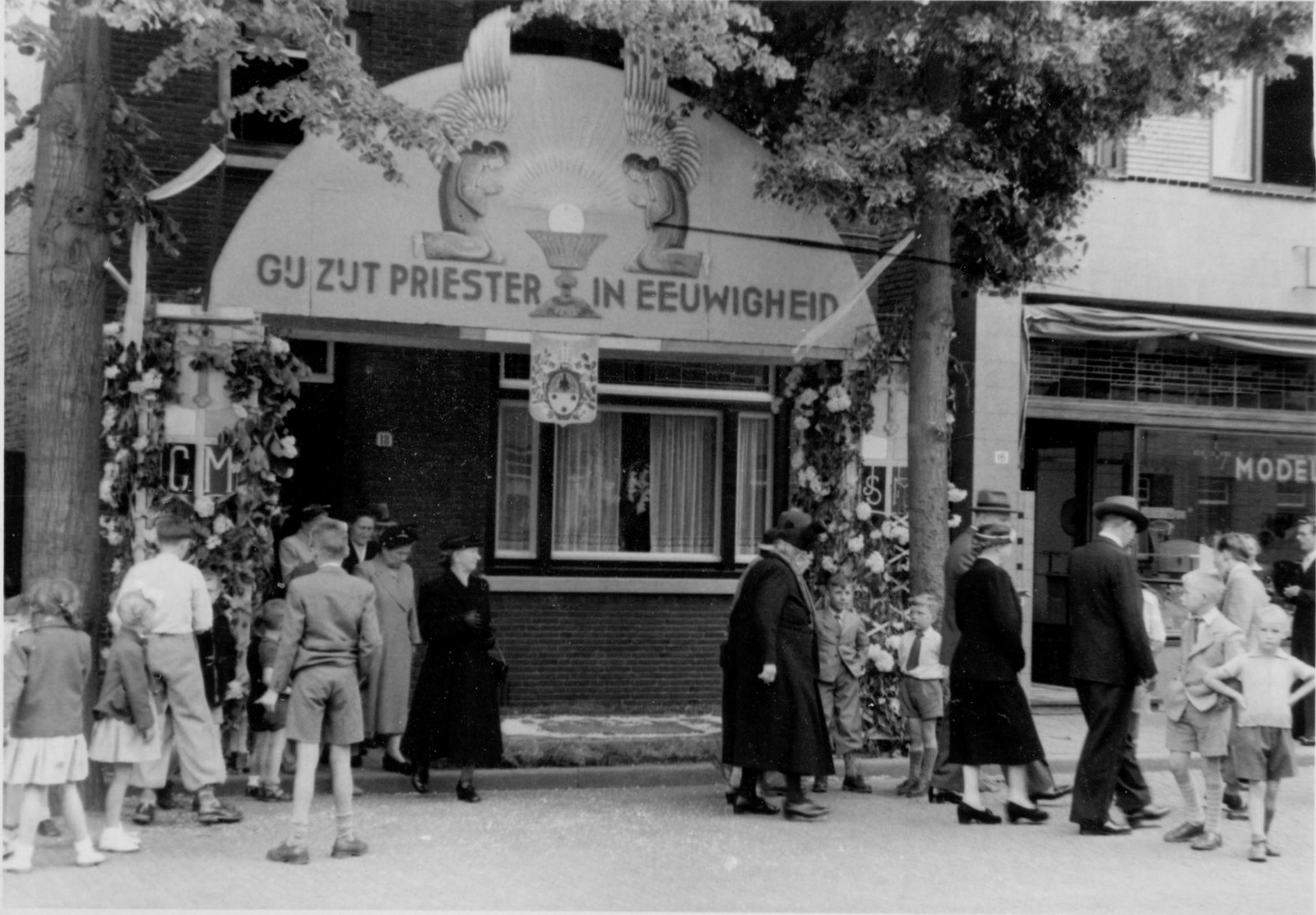 Straattafereel bij huis van een neomist(?) met versierd bord "Gij zijt priester in eeuwigheid"