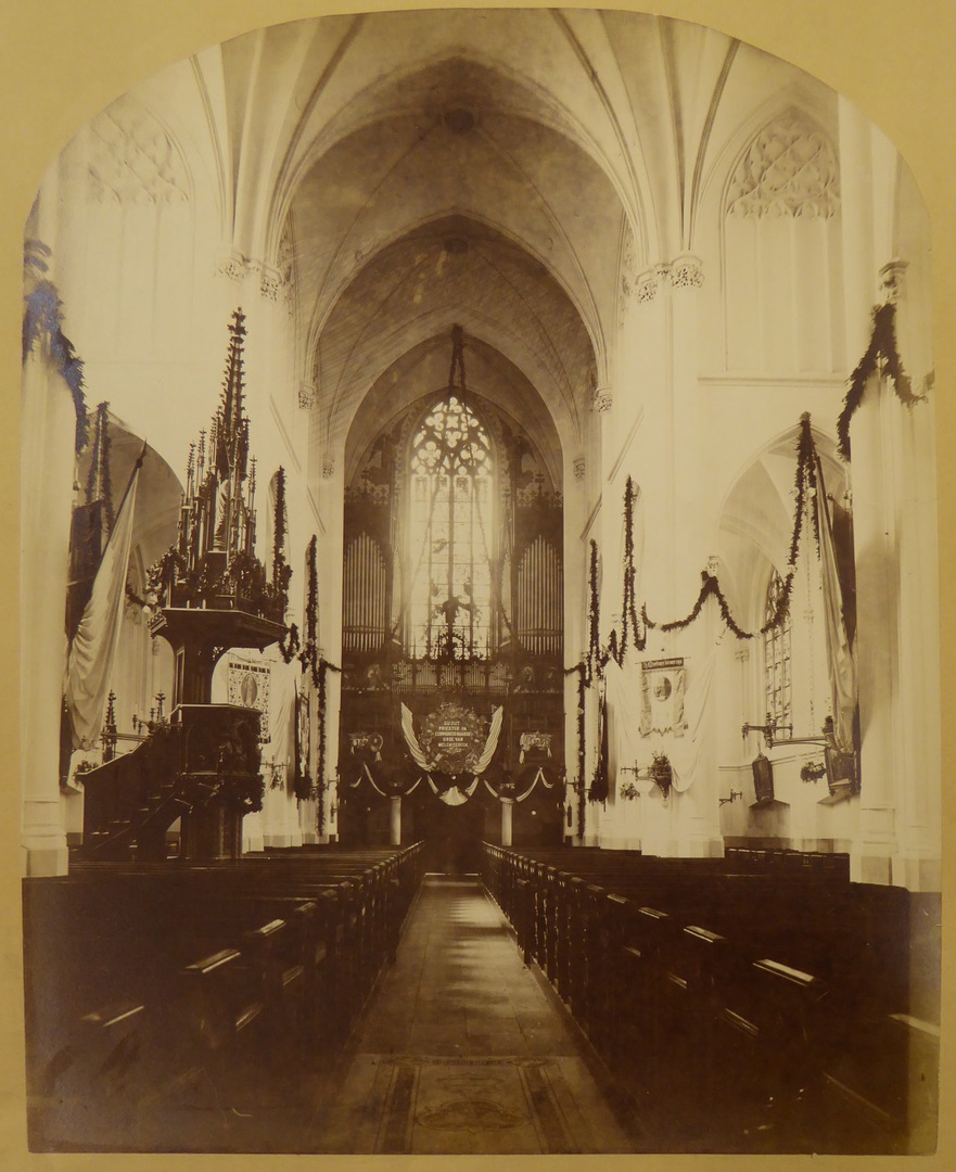 Kerkinterieur St. Walburg Arnhem naar het orgel toe