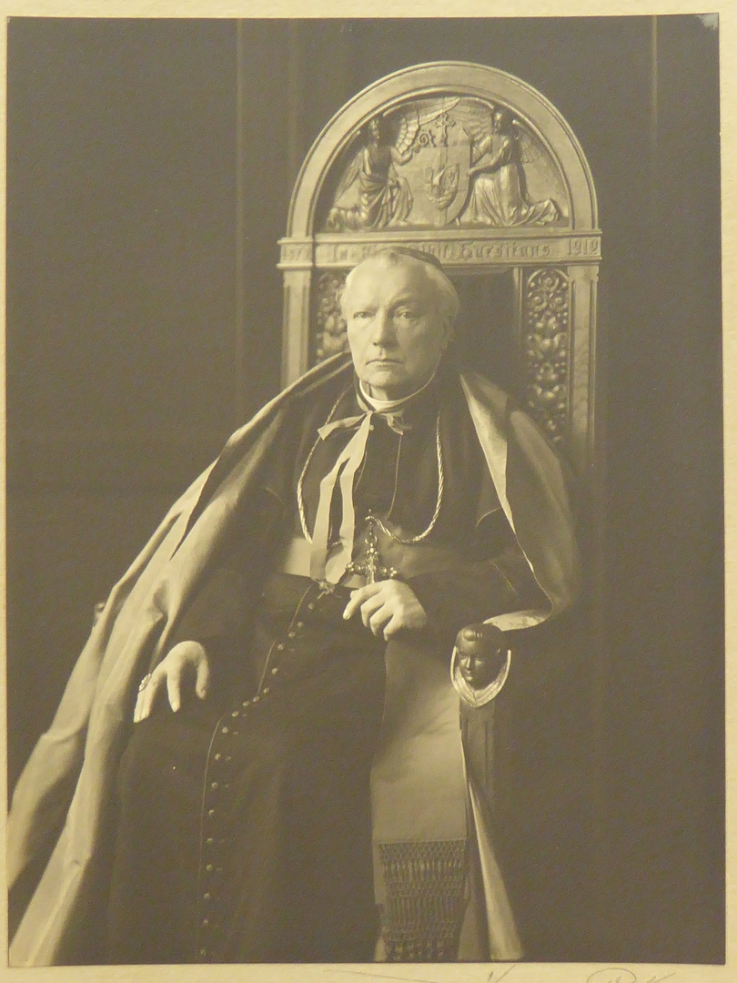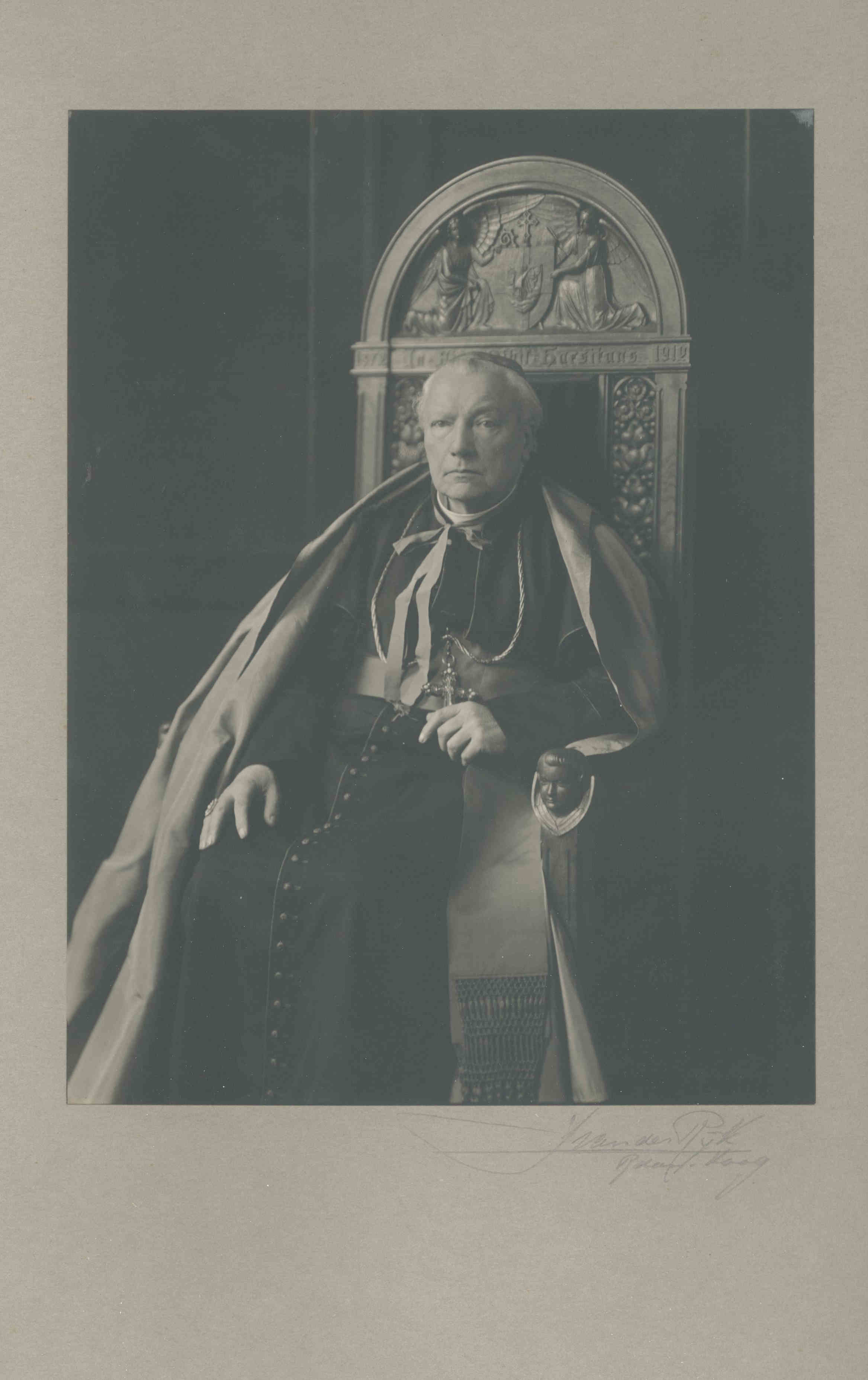 Portret in zilverdruk van bisschop Callier, zittend op de bisschopstroon in zijn ambtelijk gewaard, inclusief borstkruis. Foto op kartonnen drager, waarop in potlood: 'J. van der Rijk, R'dam [...]'